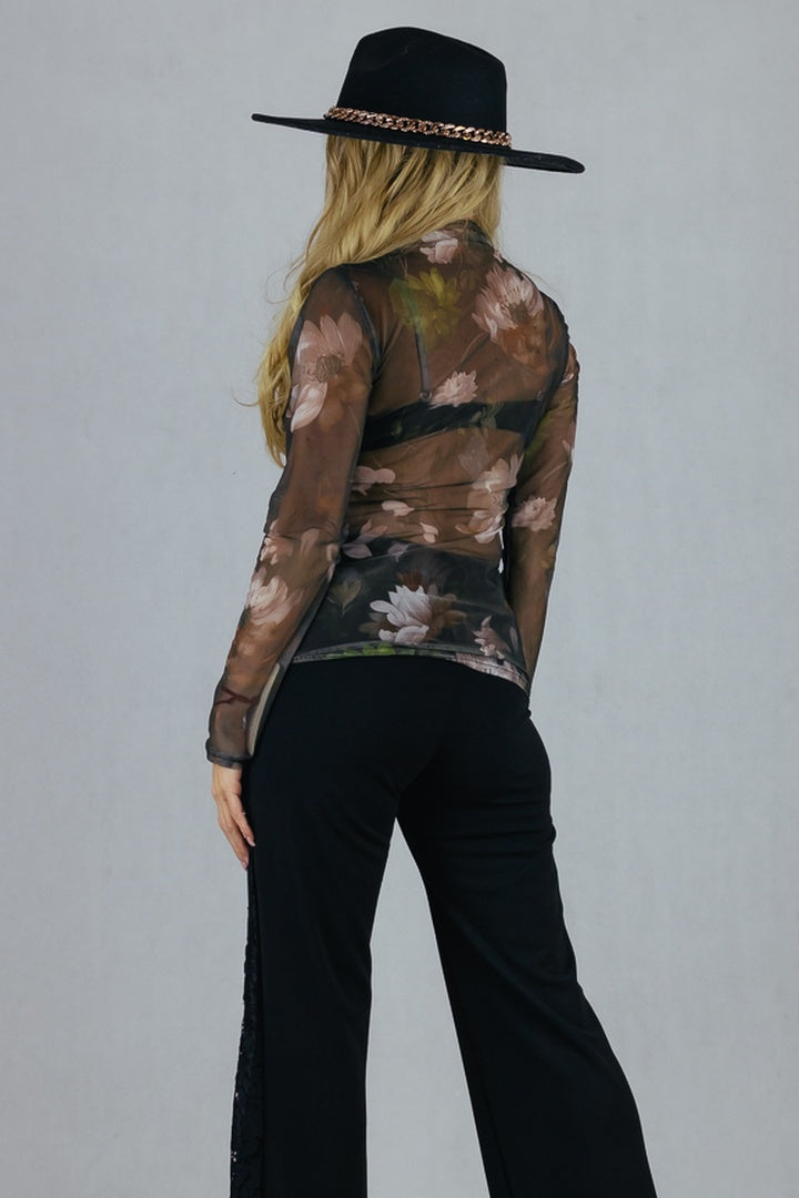 Dopasowany model bluzki w kwiaty z ozdobnymi marszczeniami
