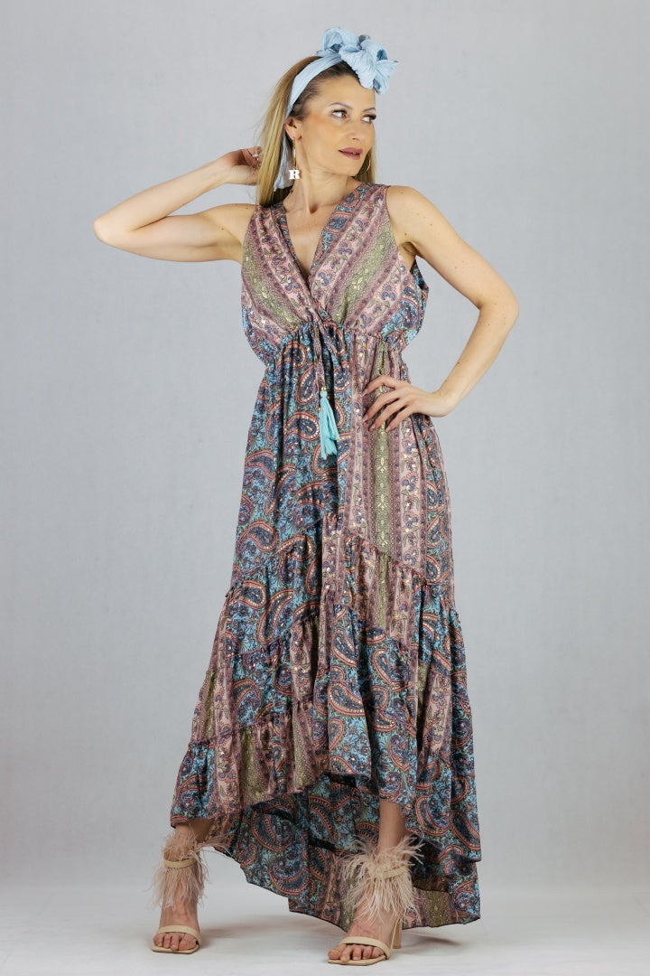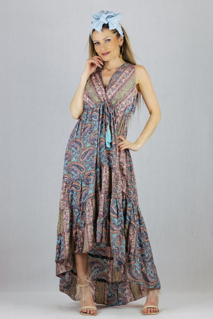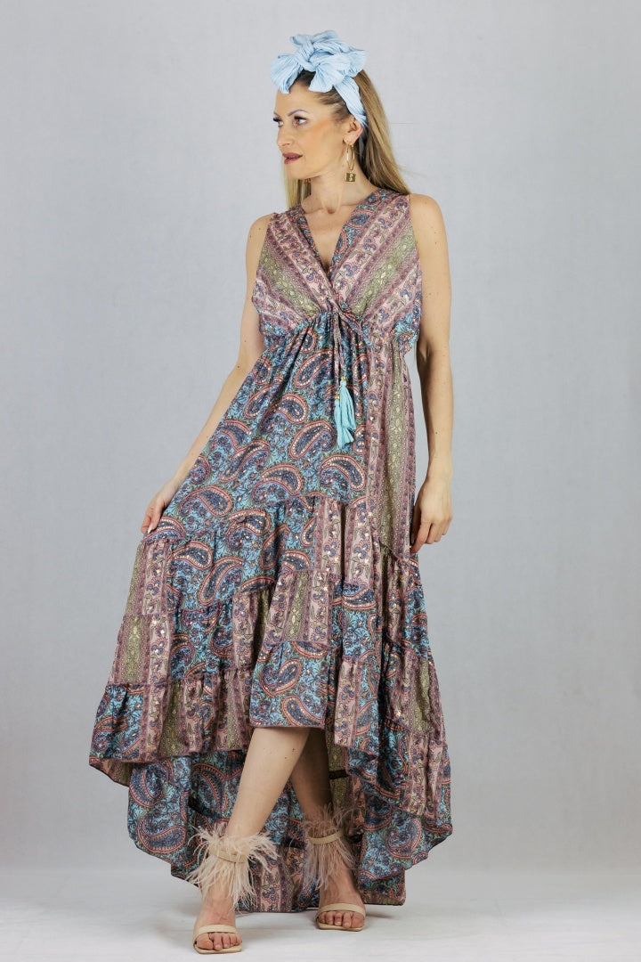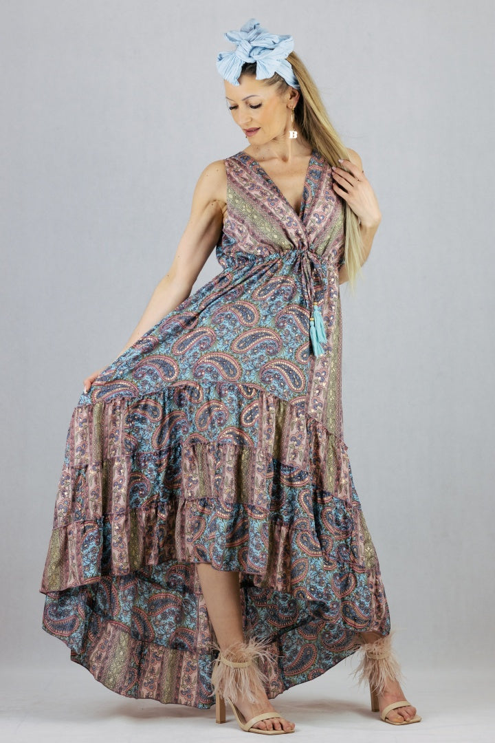 Asymetryczna sukienka jedwabna z kopertowym dekoltem.