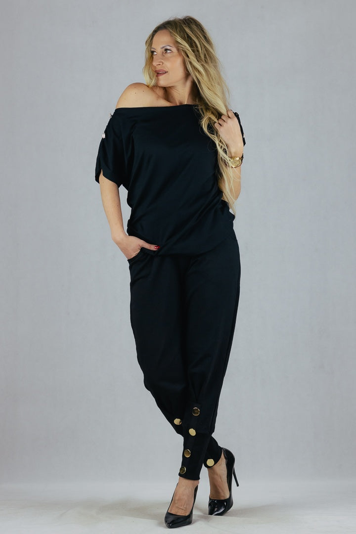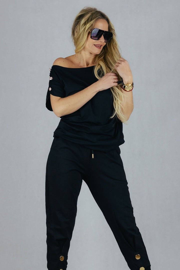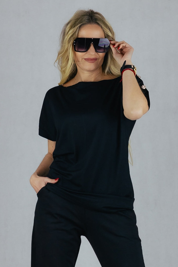Luźny model bluzki uszytej z wiskozy, zdobiona biżuteryjnymi guzikami