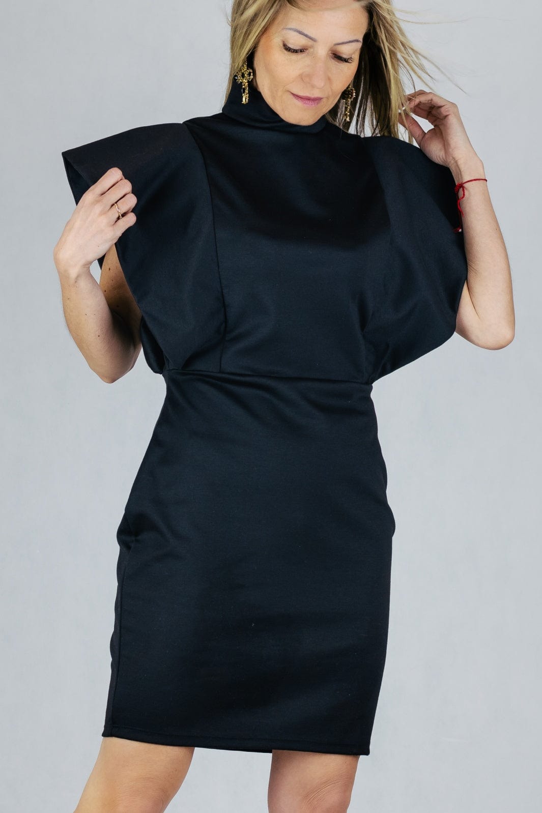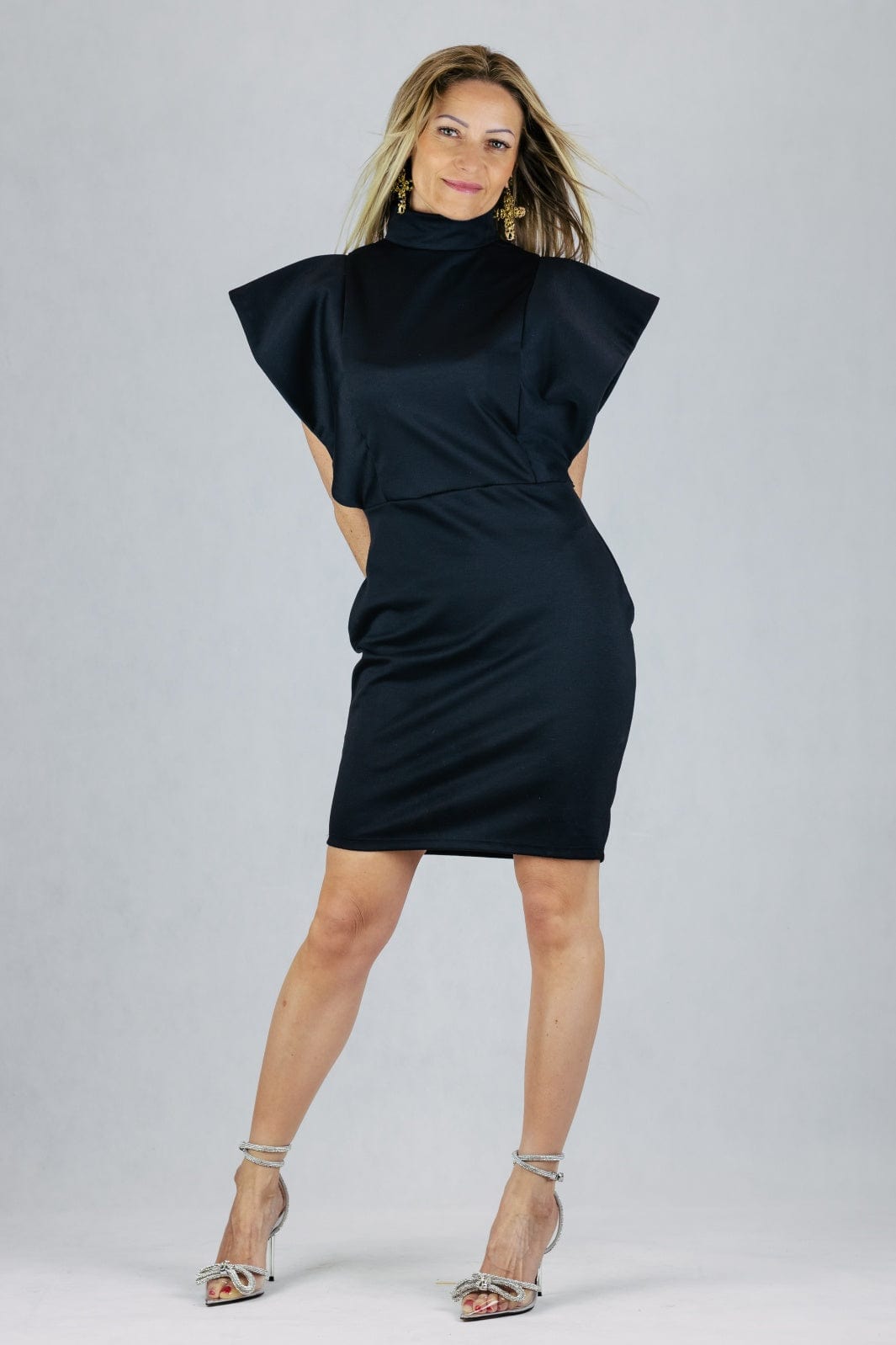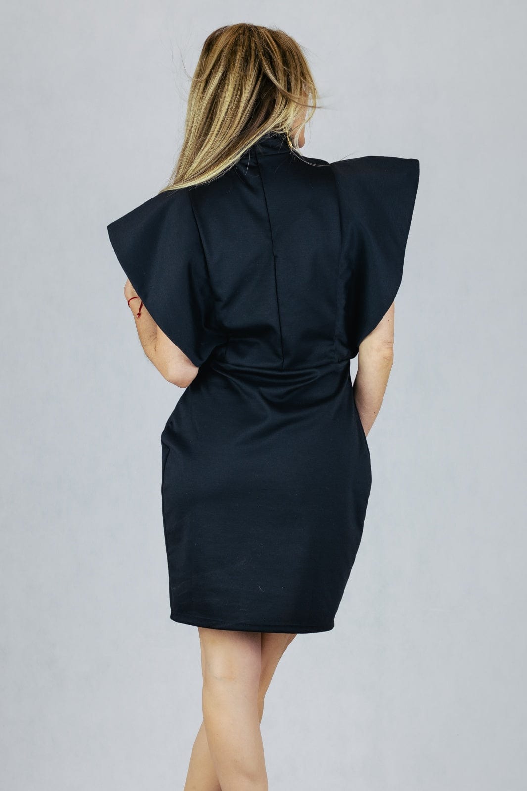 Koktajlowa sukienka z efektownym rękawem z szerokiej falbany.