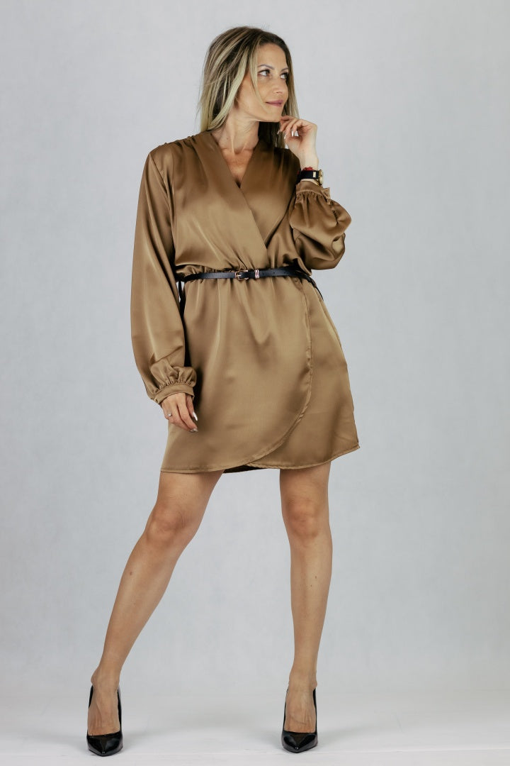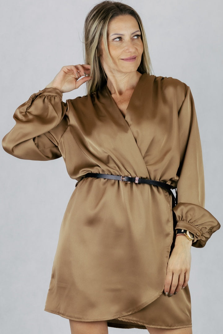 Elegancka sukienka z paskiem - brązowa