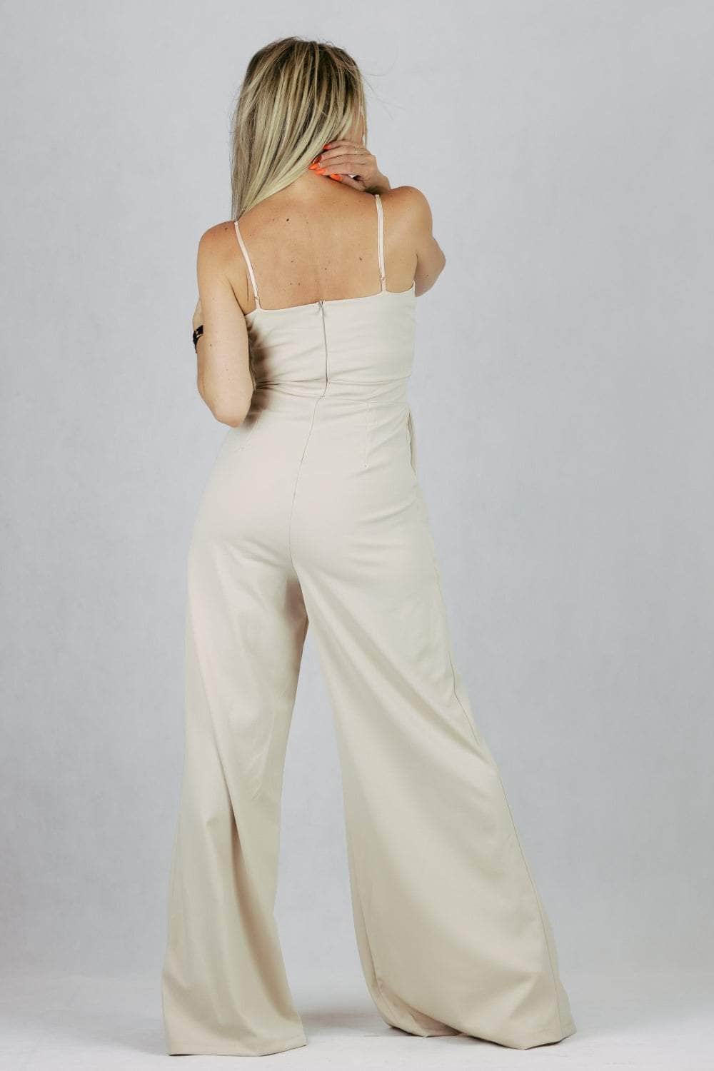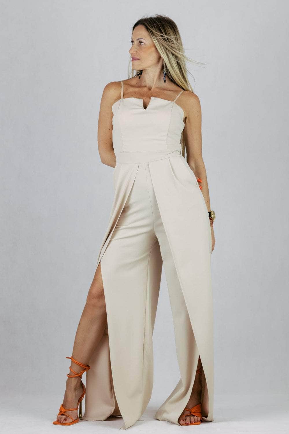 Kombinezon z regulowanymi ramiączkami i szerokimi nogawkami z pęknięciem.