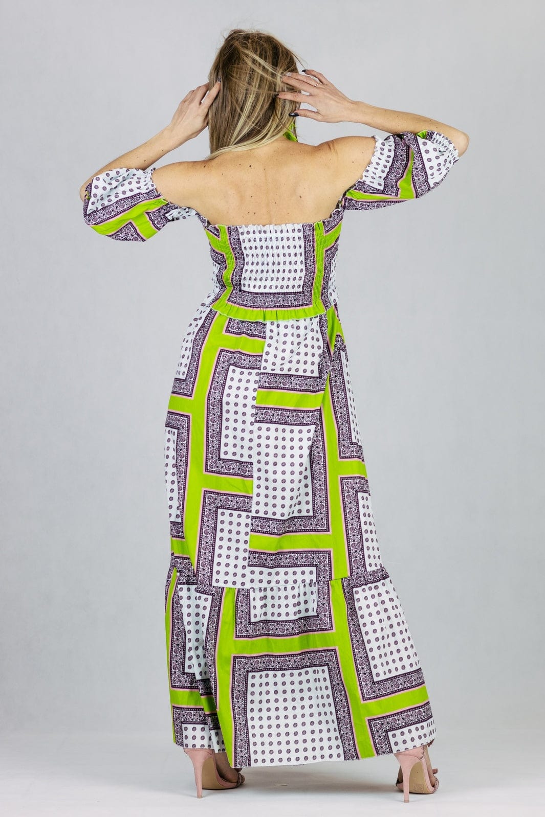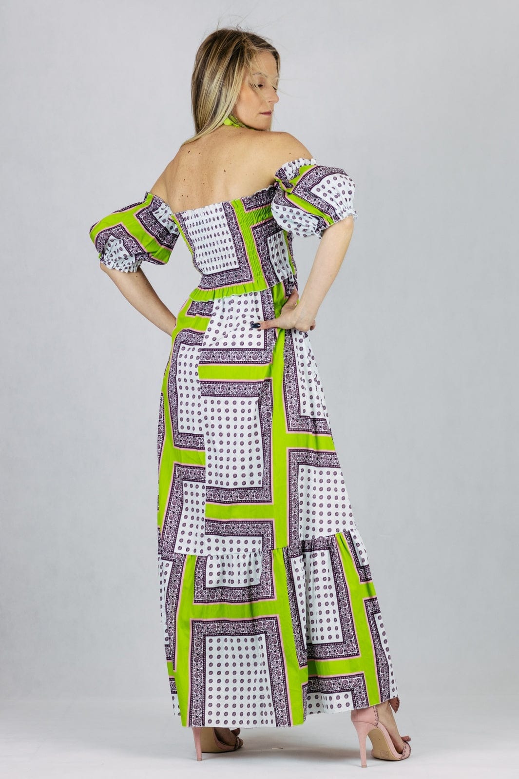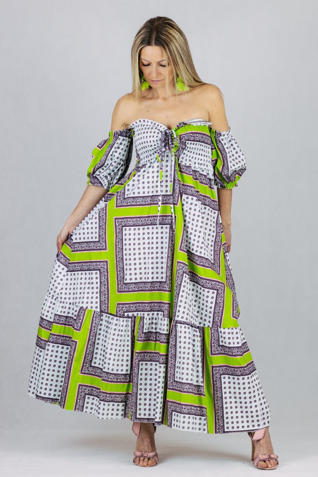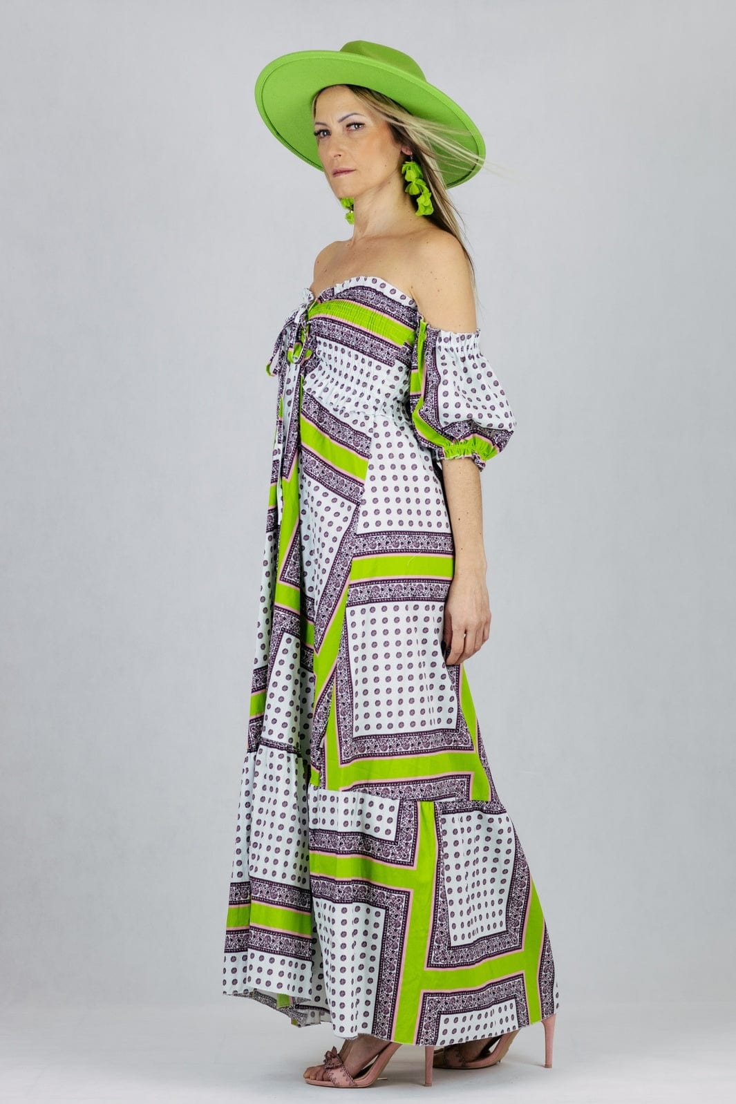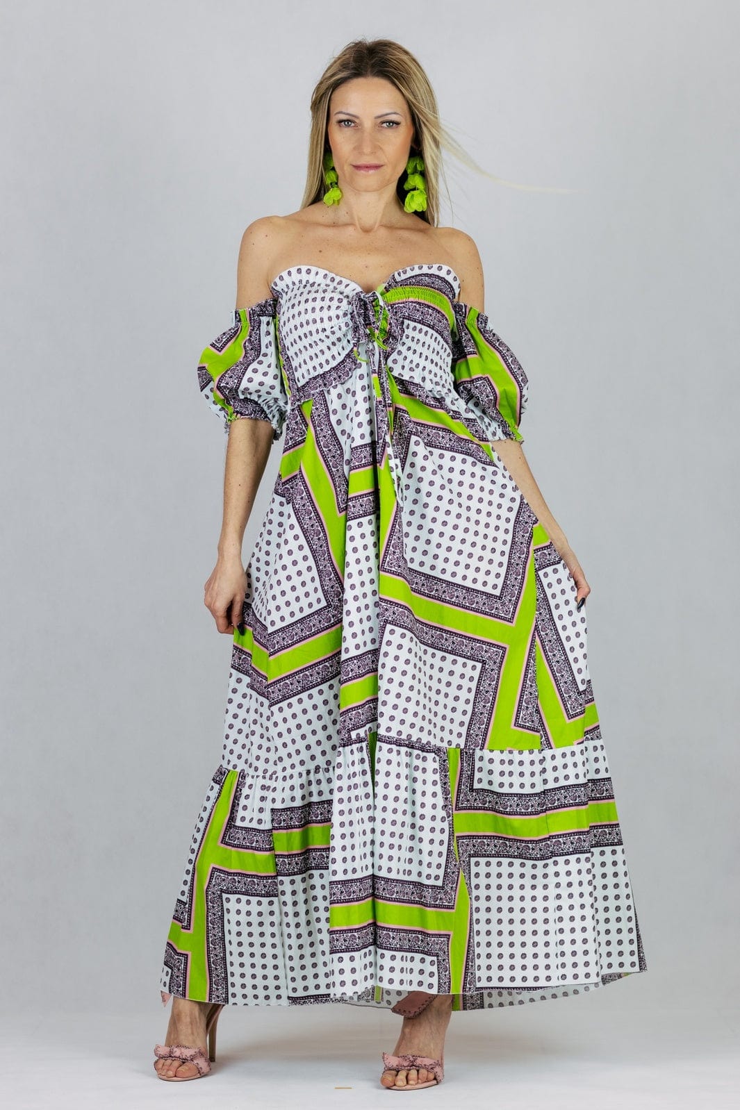 Sukienka Maxi z odkrytymi ramionami i rękawami doszytymi pod pachami. Uszyta z bawełny.