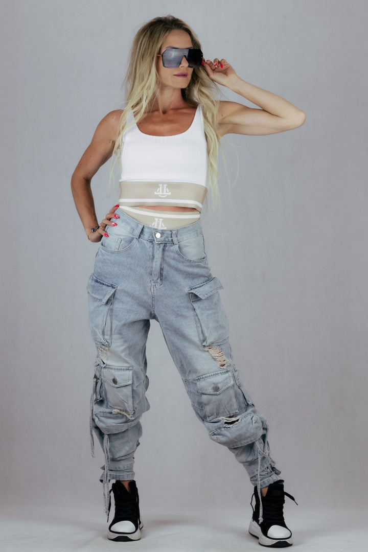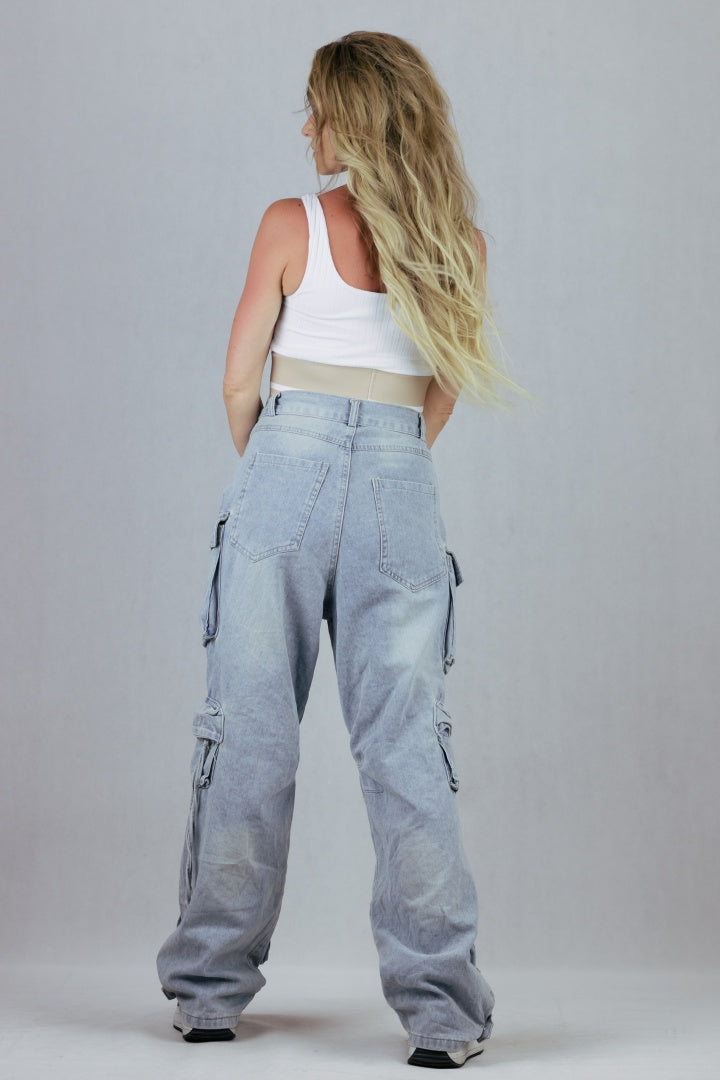 Luźny model bojówek z mnóstwem kieszeni.