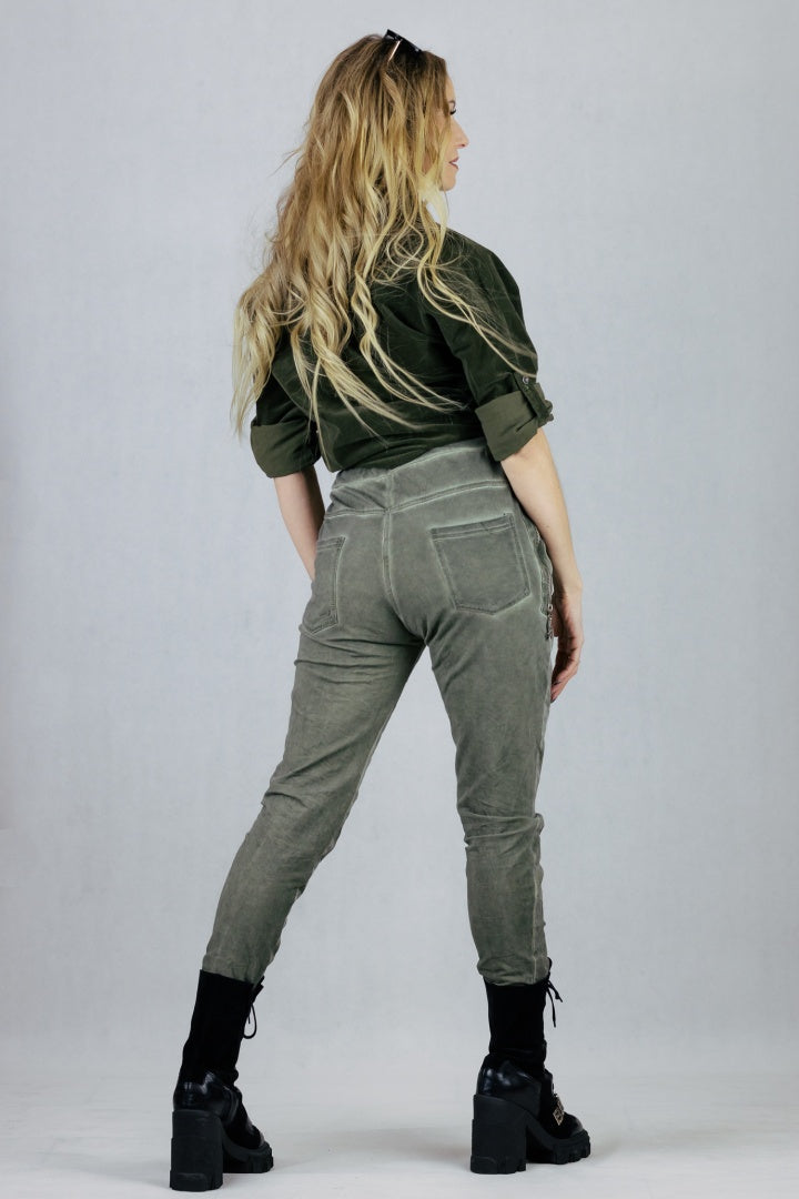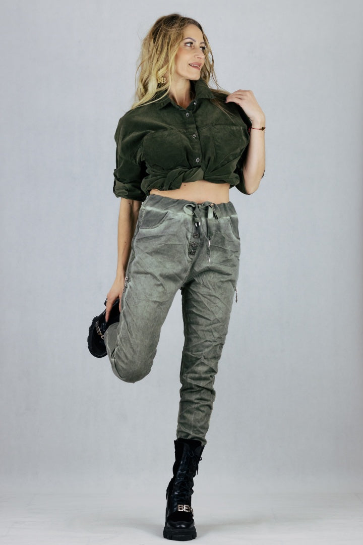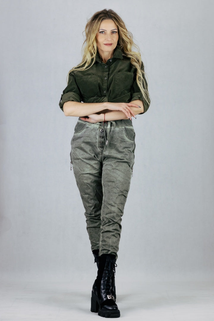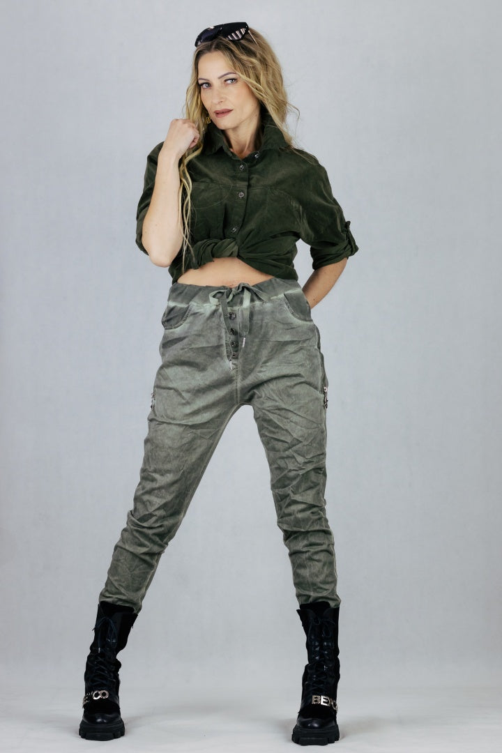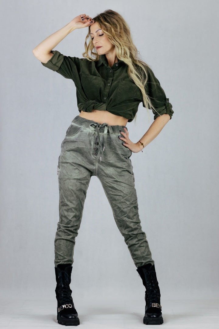 Spodnie gnieciuchy z troczkiem do regulacji talii.