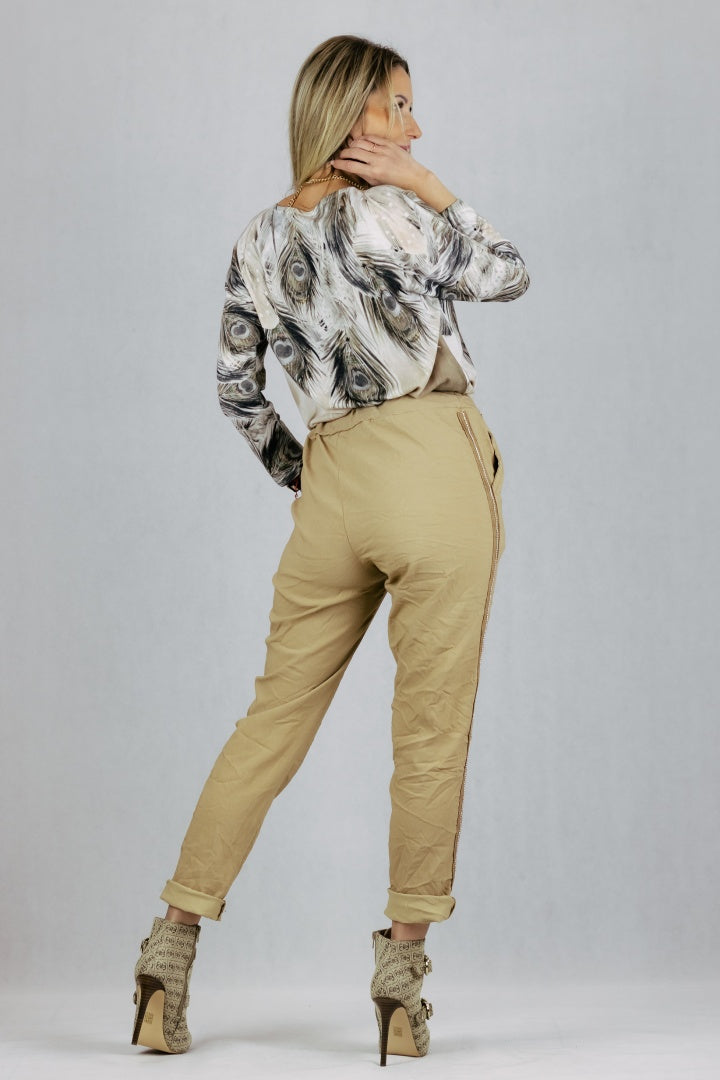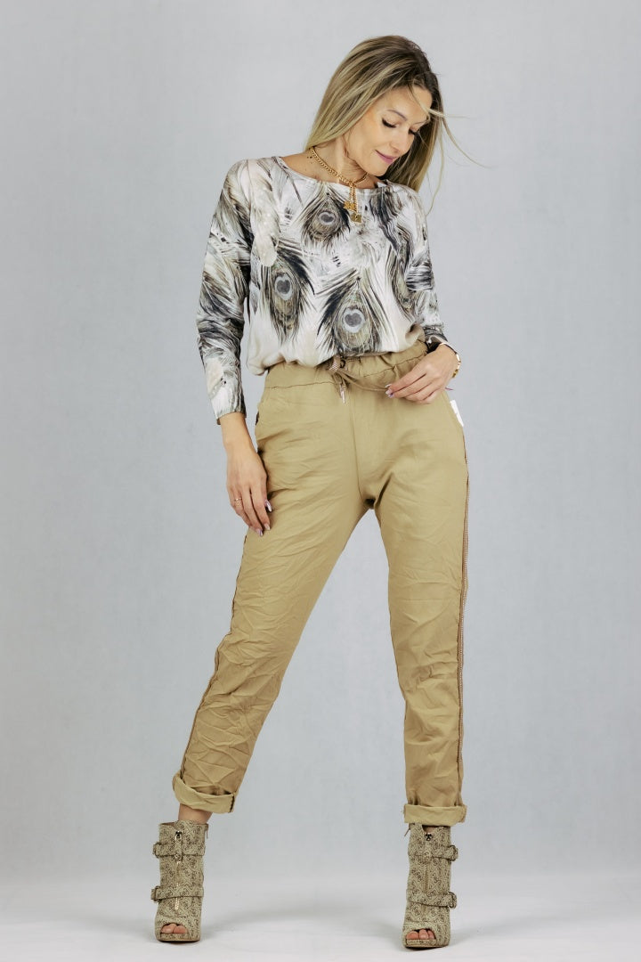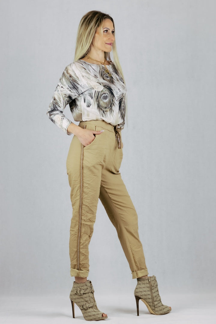 Spodnie gnieciuchy z cyrkoniami i troczkiem do regulacji talii.