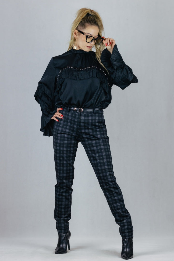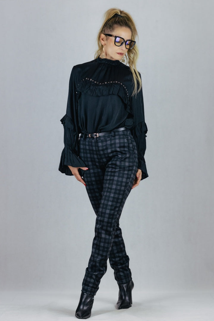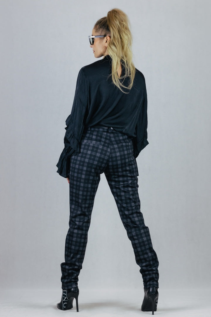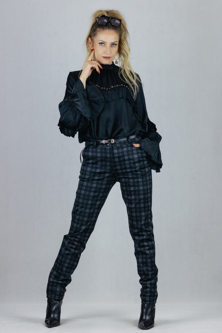 Eleganckie spodnie typu cygaretki, wzór w kratkę.