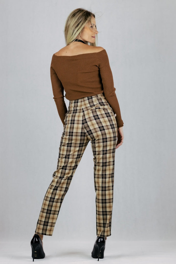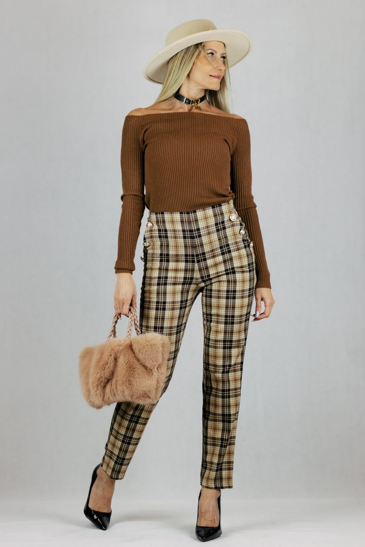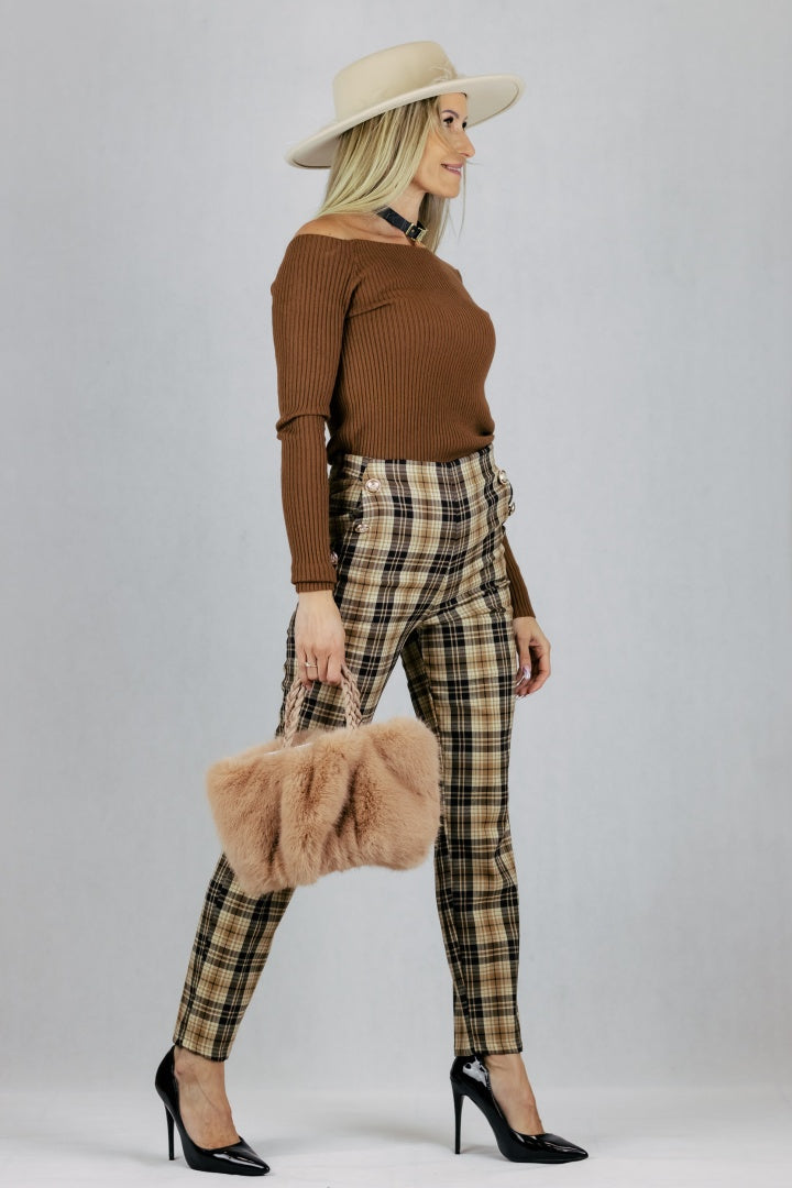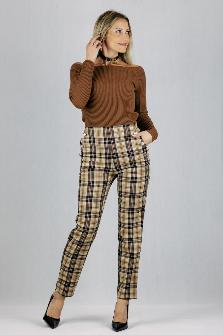 Eleganckie spodnie w kratę z wyższym stanem zdobione złotymi guzikami i połyskującą nitką.