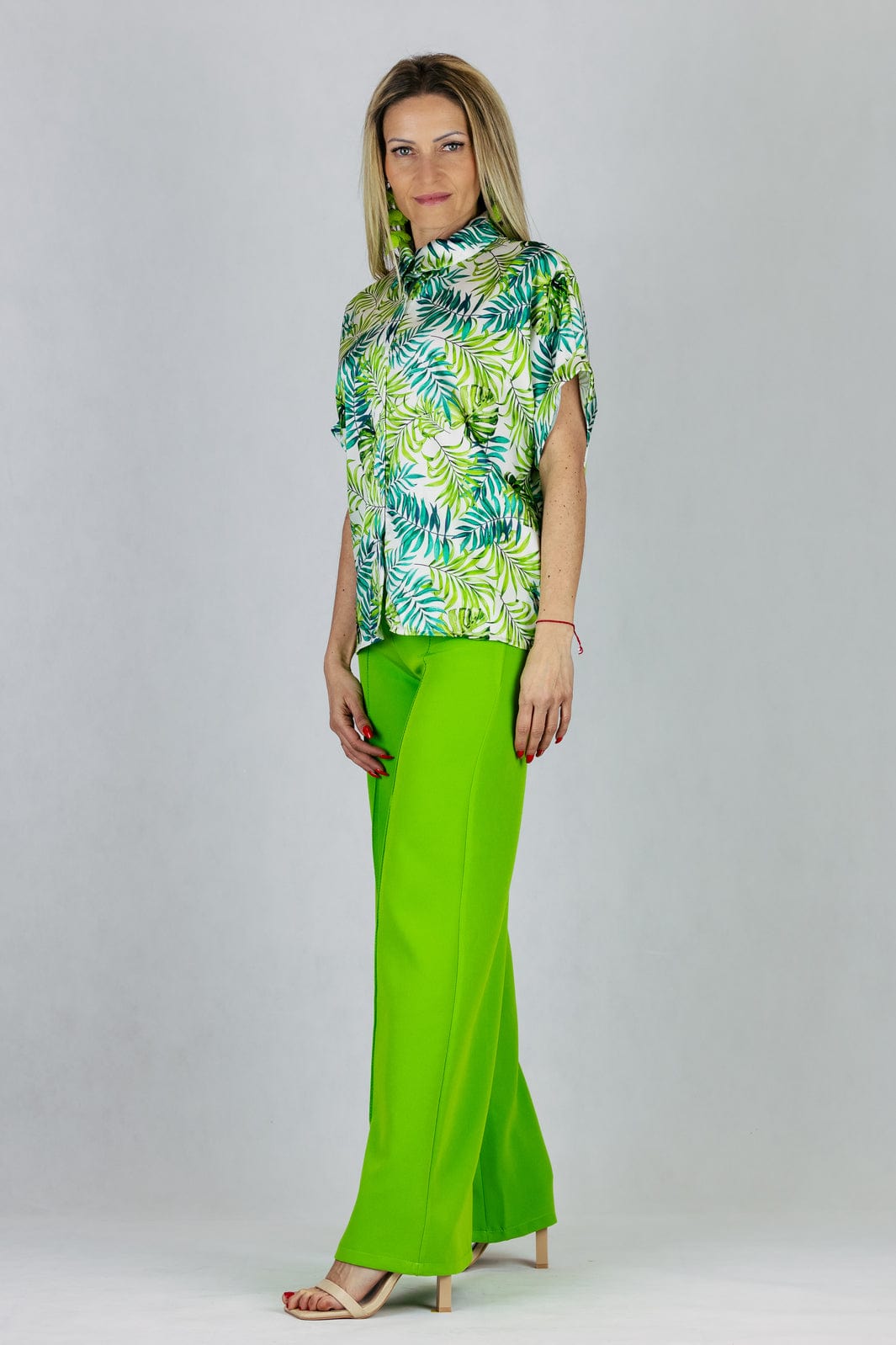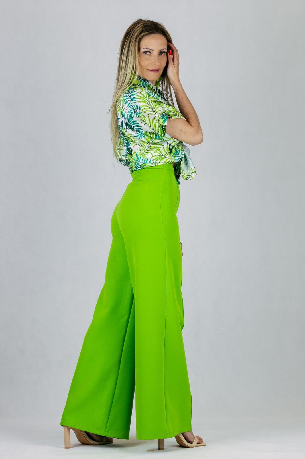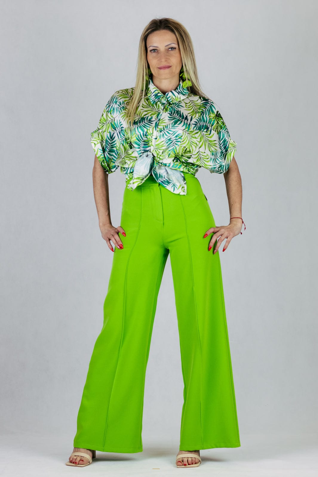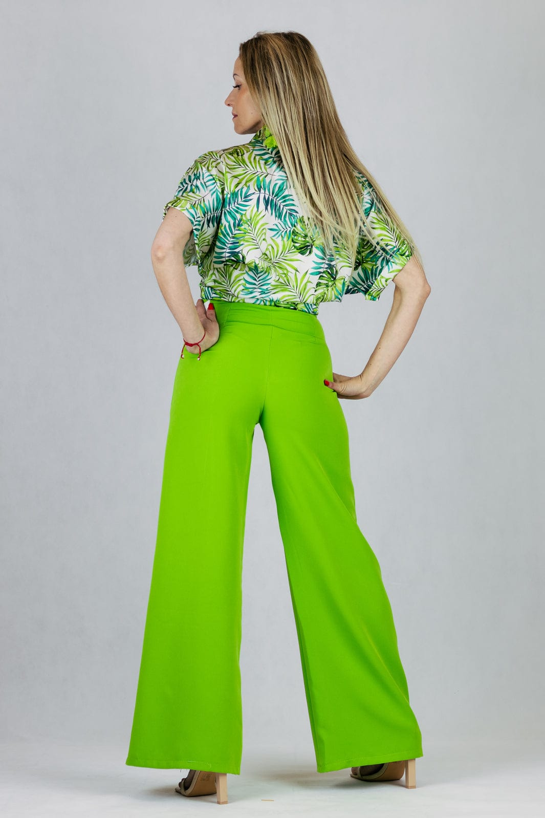 Spodnie z rozszerzana nogawką i przeszywanym kantem.