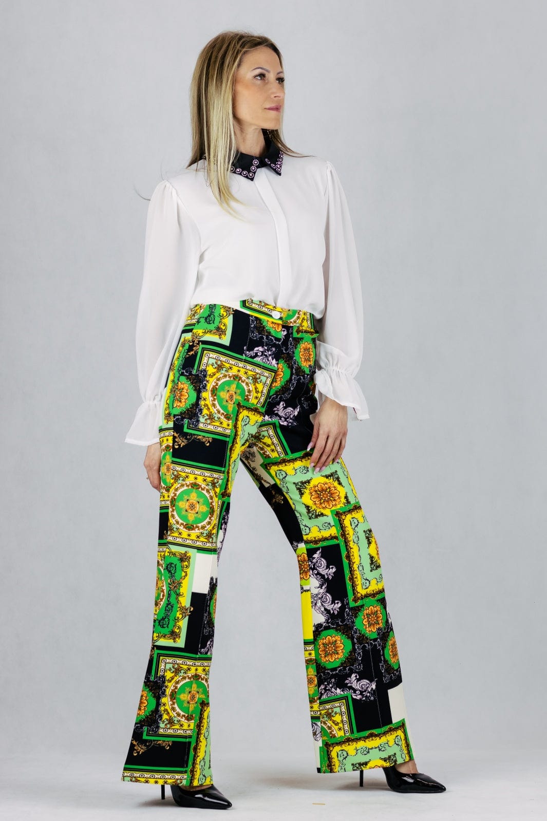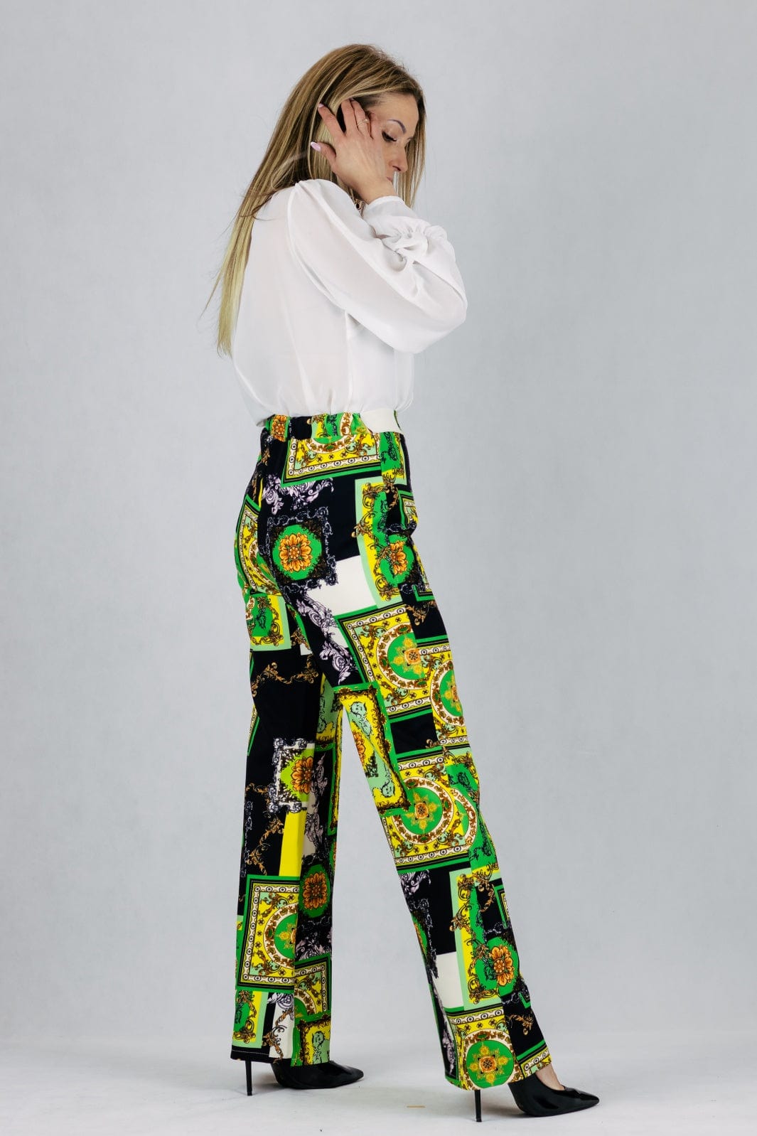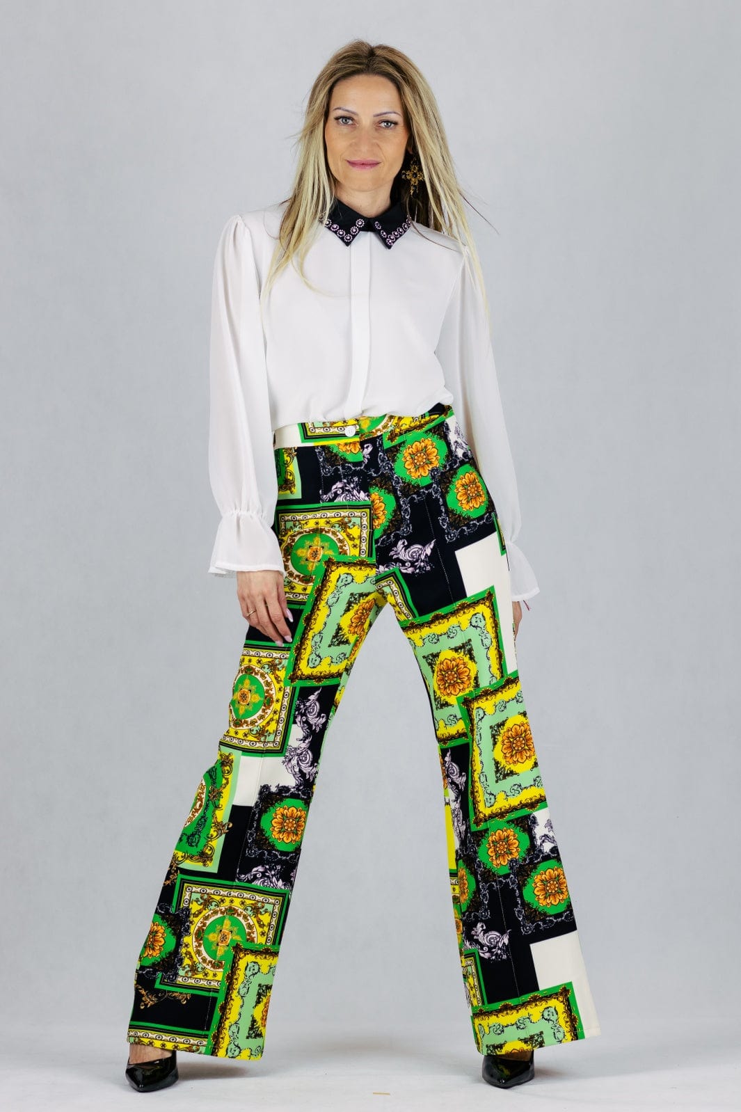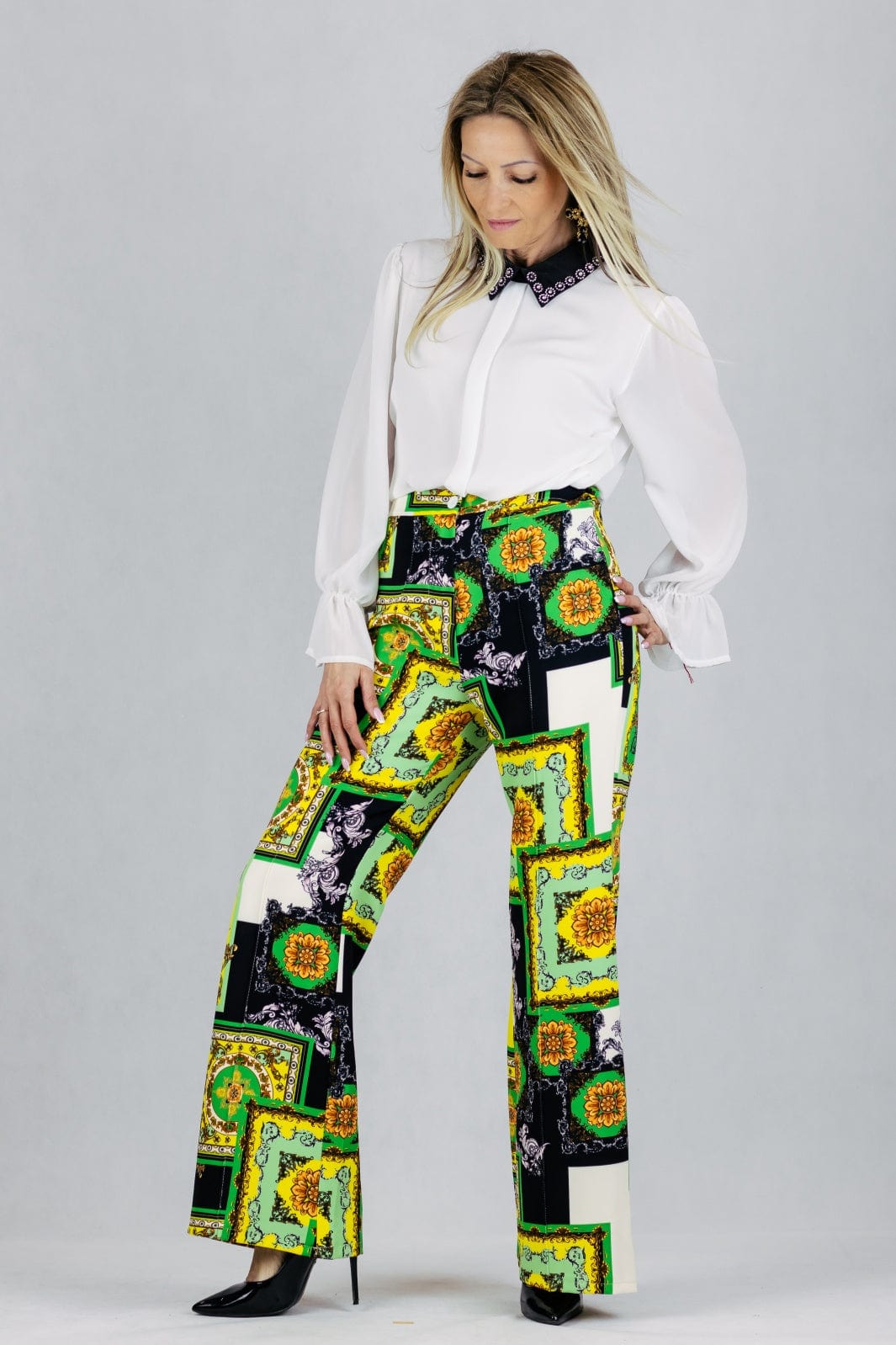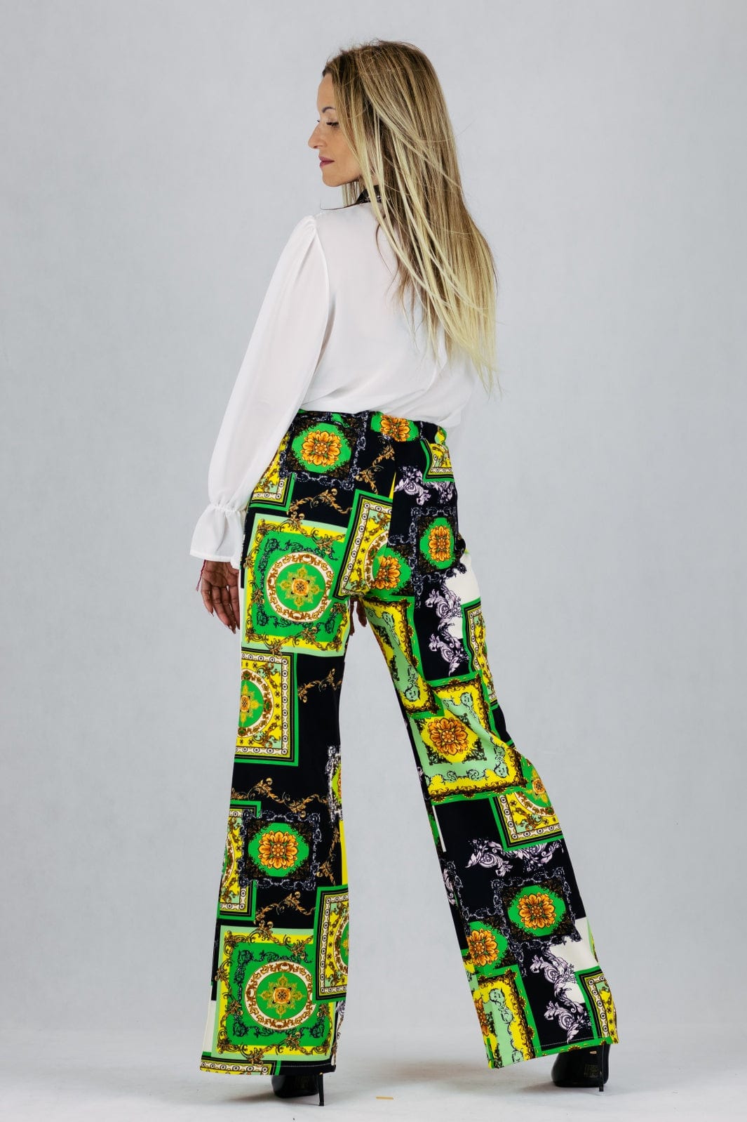 Spodnie we wzory z szeroką nogawką przeszywanym kantem.