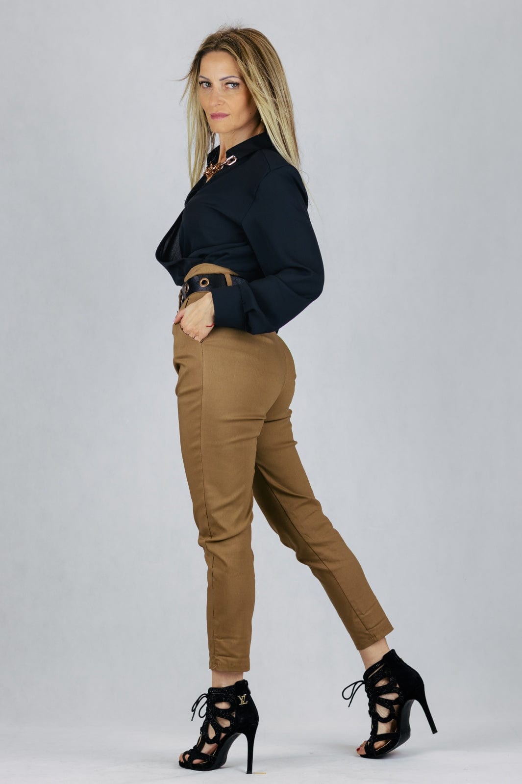 Spodnie z wysokim stanem z kieszeniami. W zestawie pasek.
