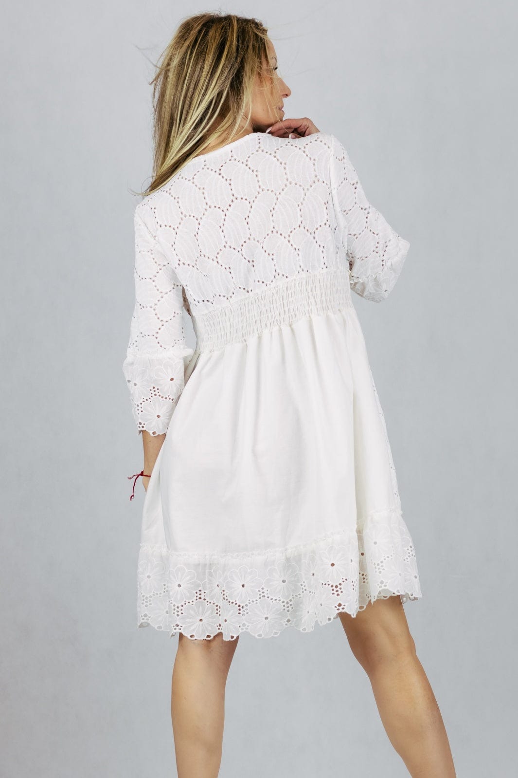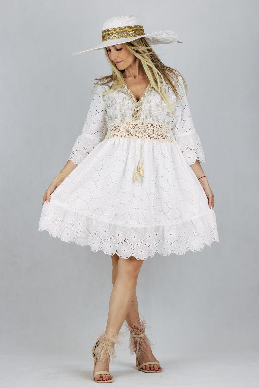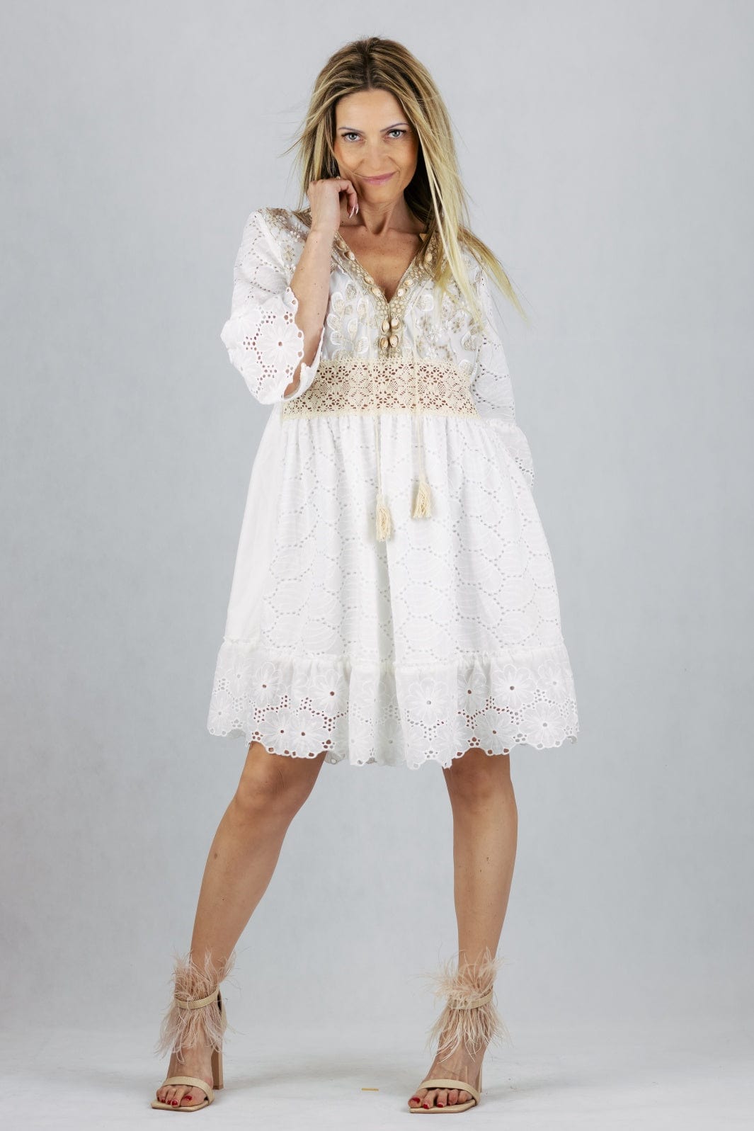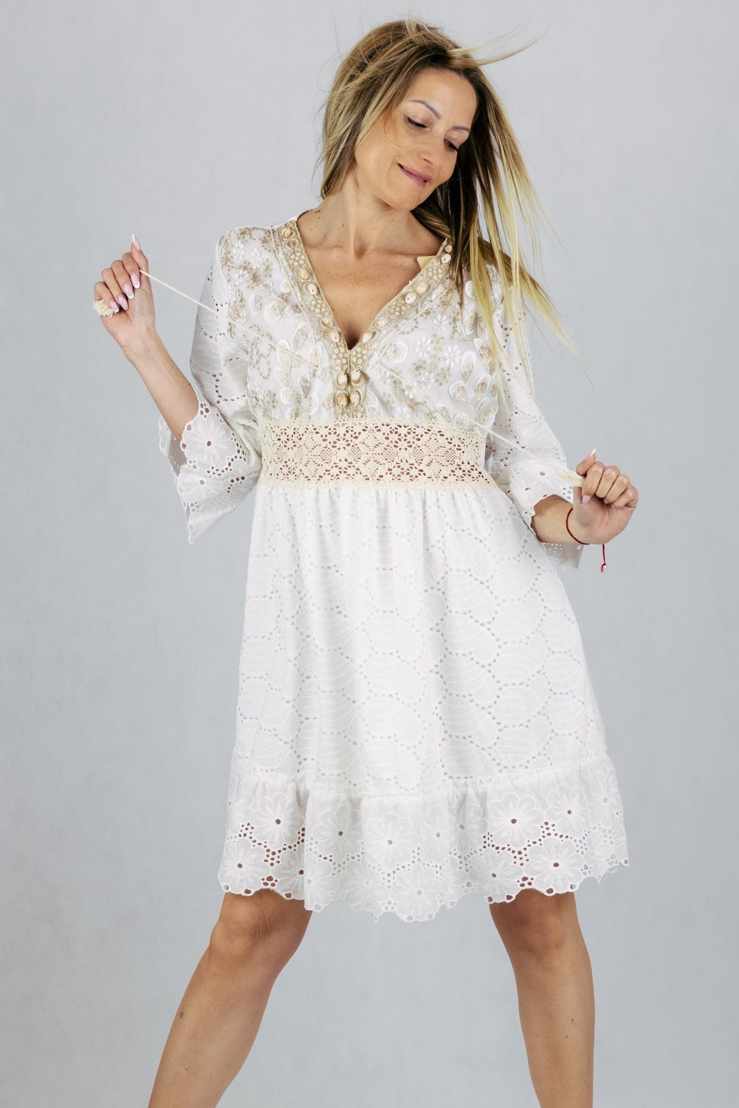 Sukienka mini boho z haftem, zdobiona muszelkami.