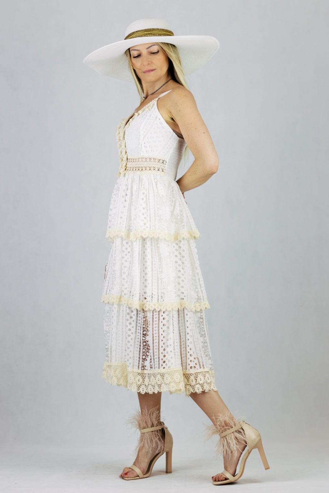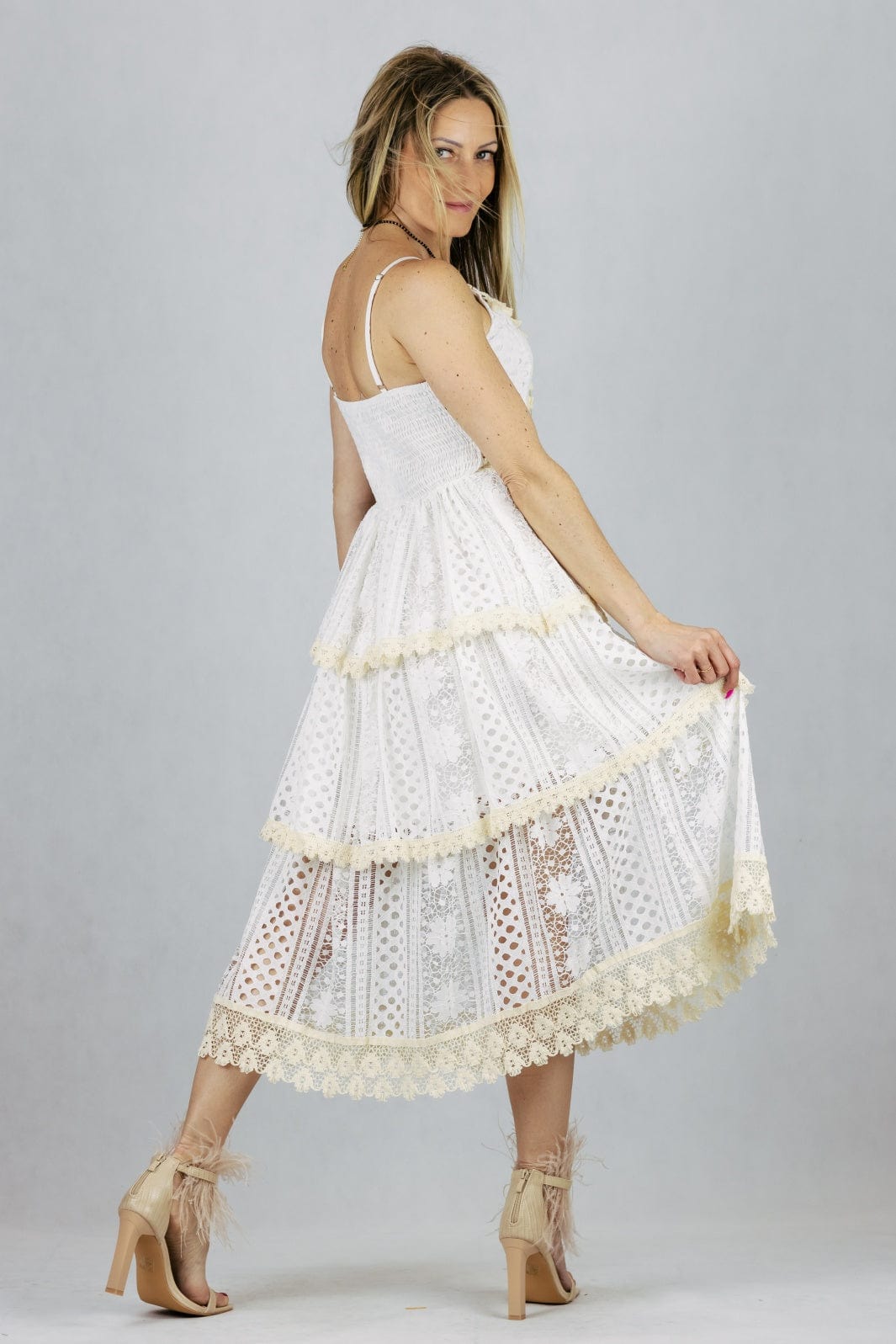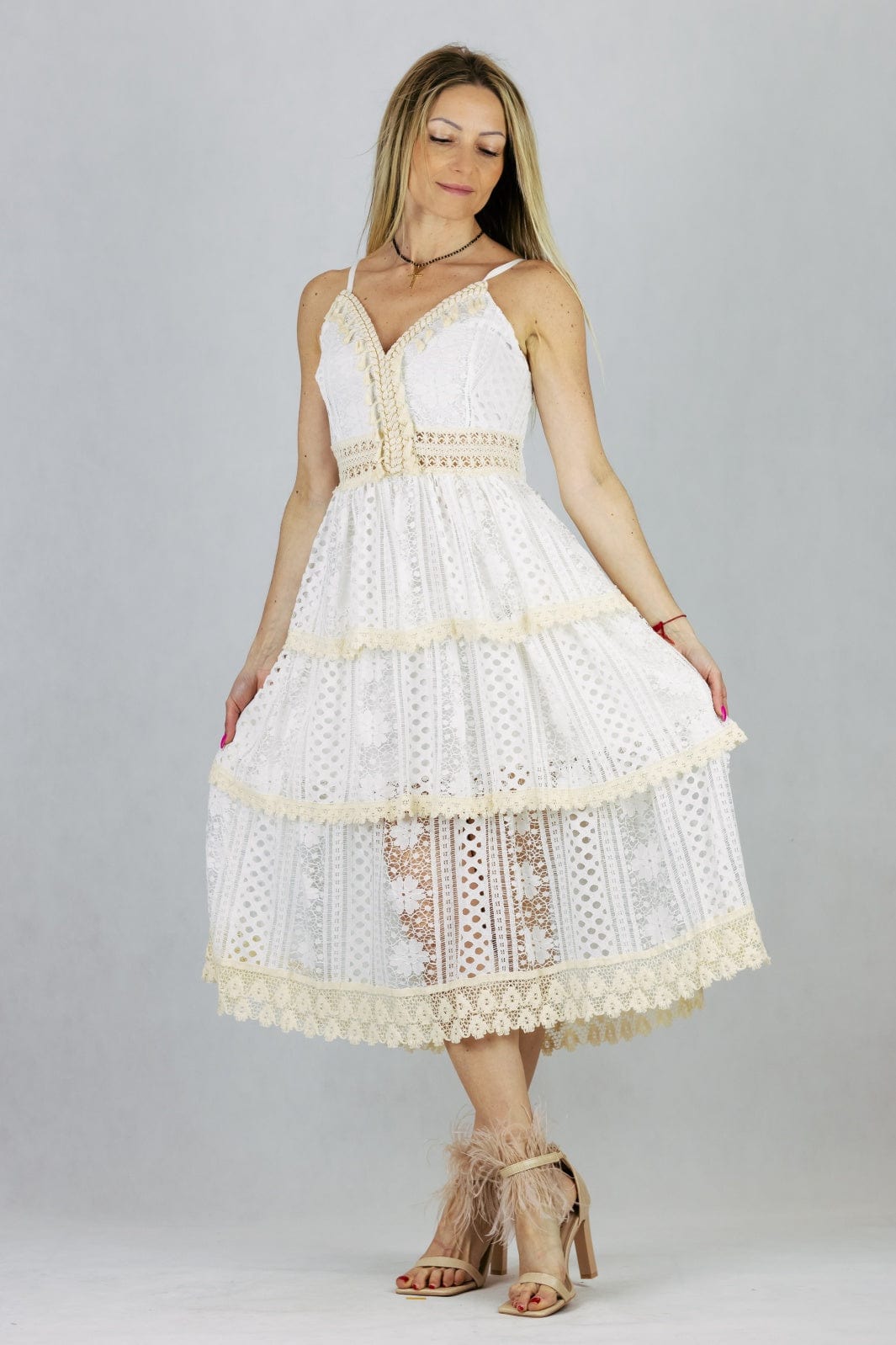 Letnia sukienka boho o długości maxi z koronkowej tkaniny.