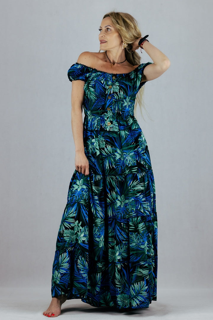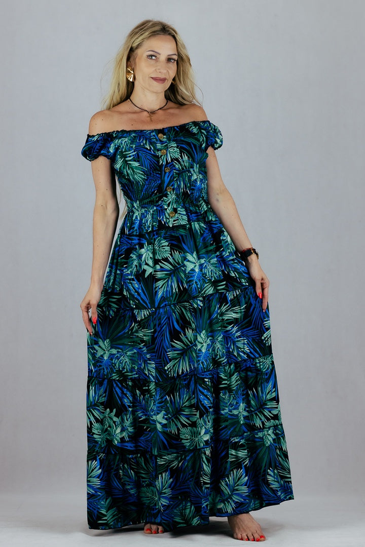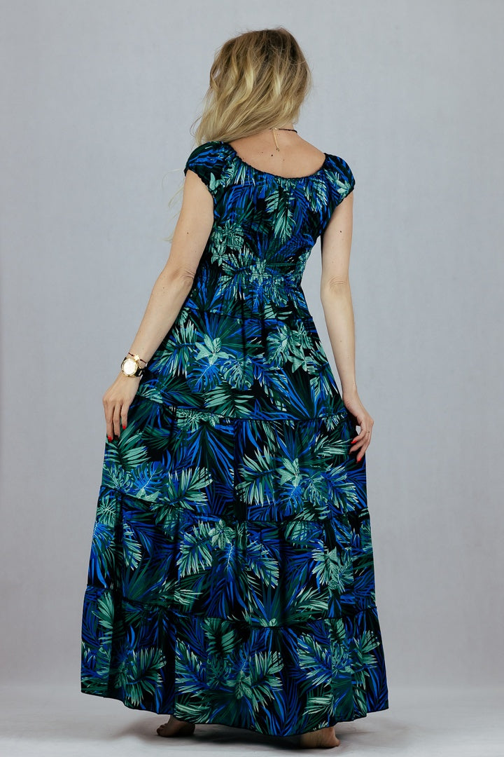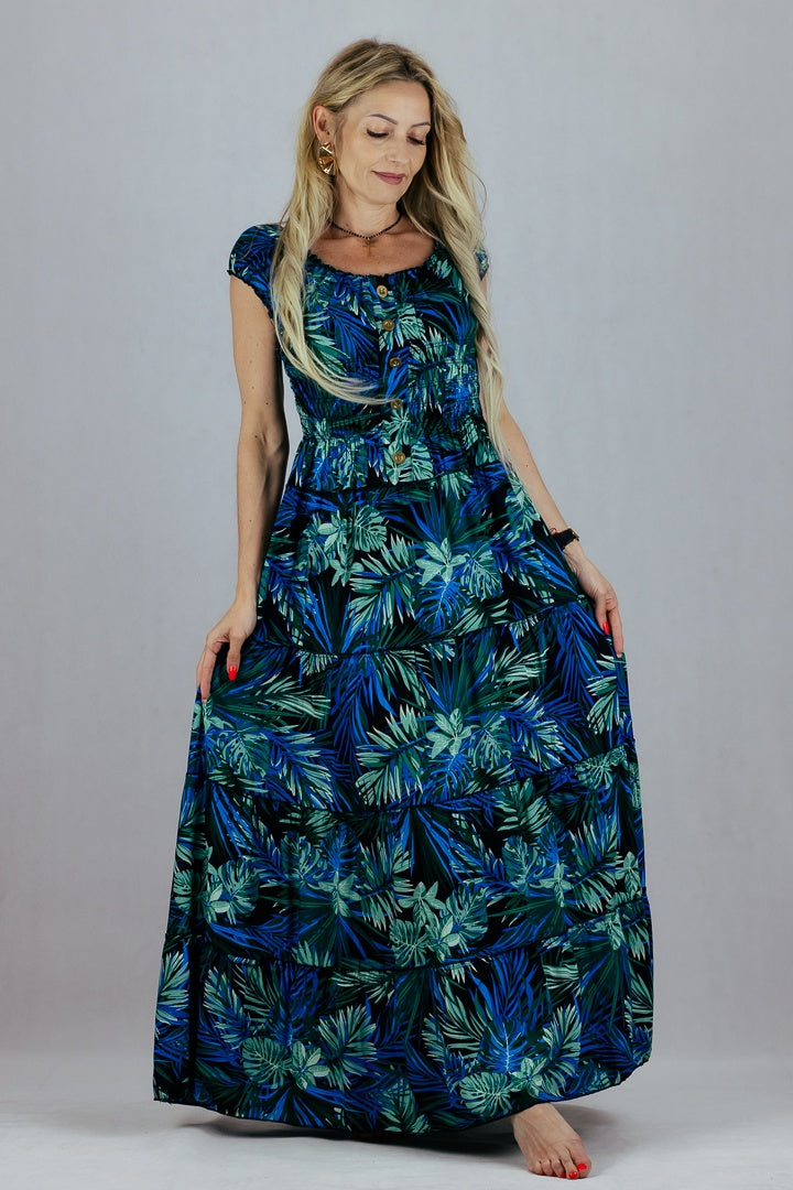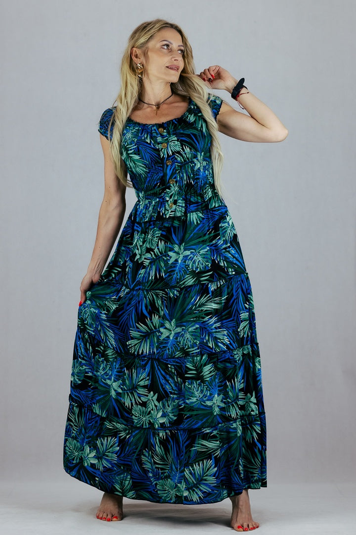 Sukienka hiszpanka w tropikalne liście Miss Sara Fashion - niebieska