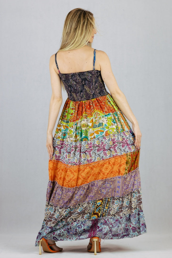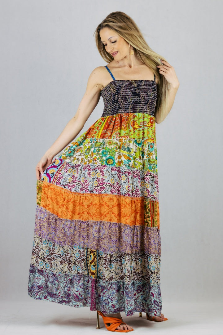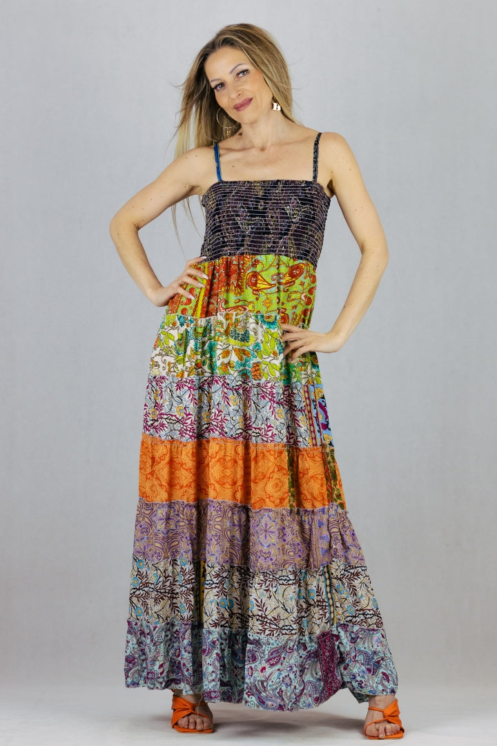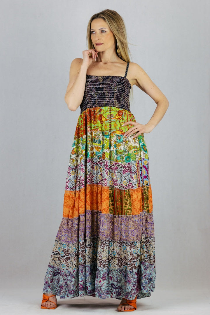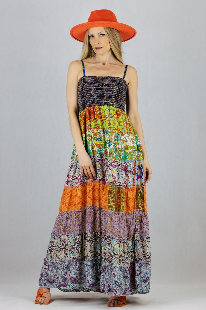 Jedwabna sukienka maxi na szelkach.