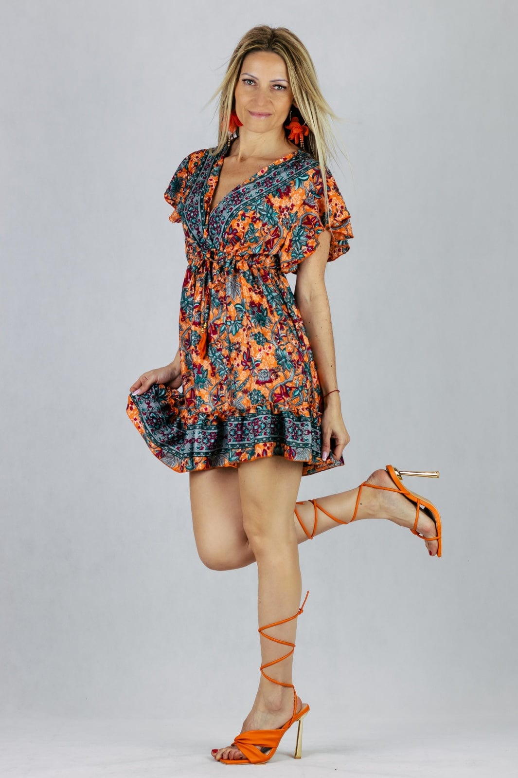 Sukienka mini z rozkloszowanym dołem, z dekoltem w kształcie litery V i motylkowymi rękawami. Uszyta z jedwabiu.