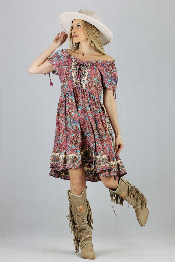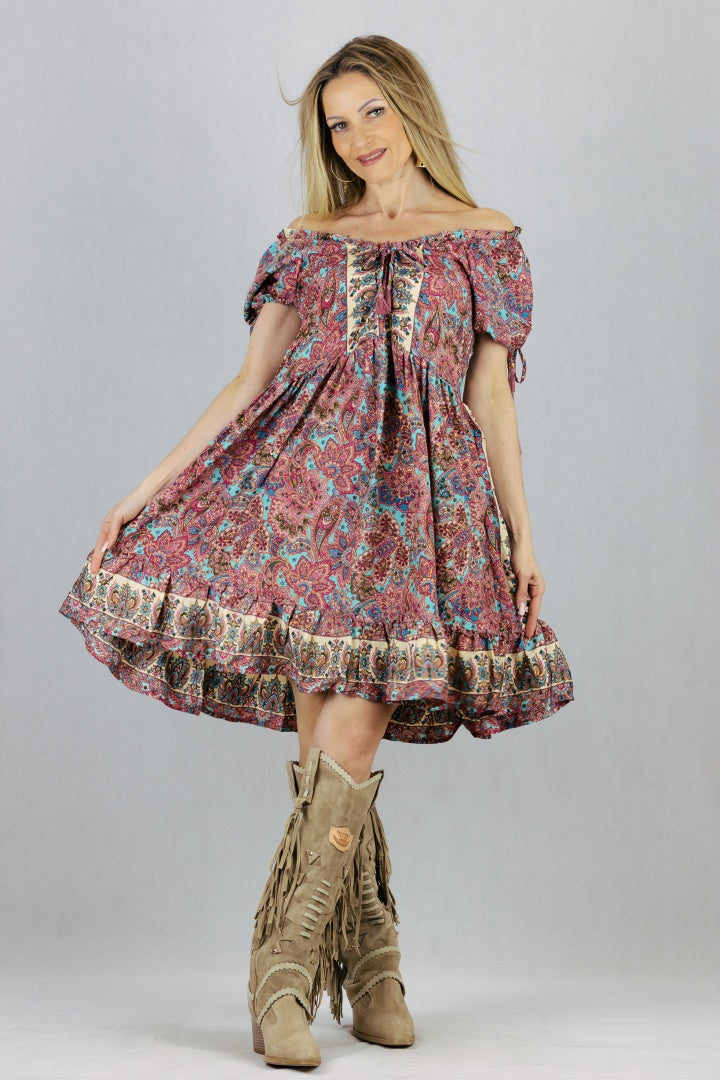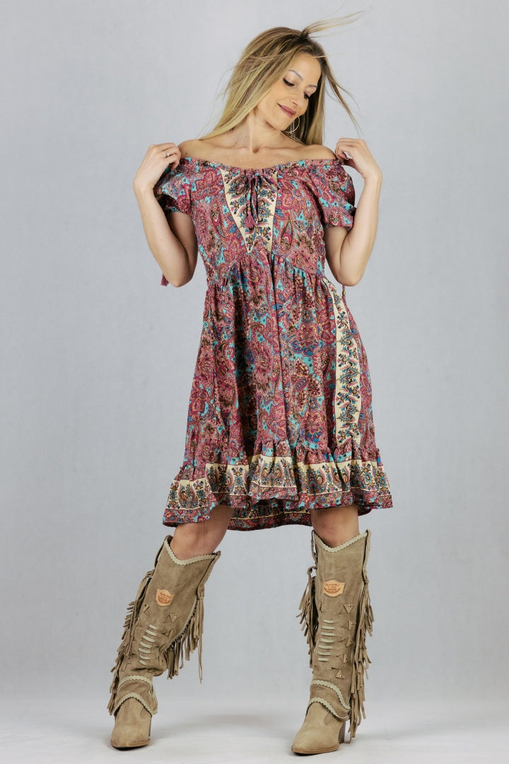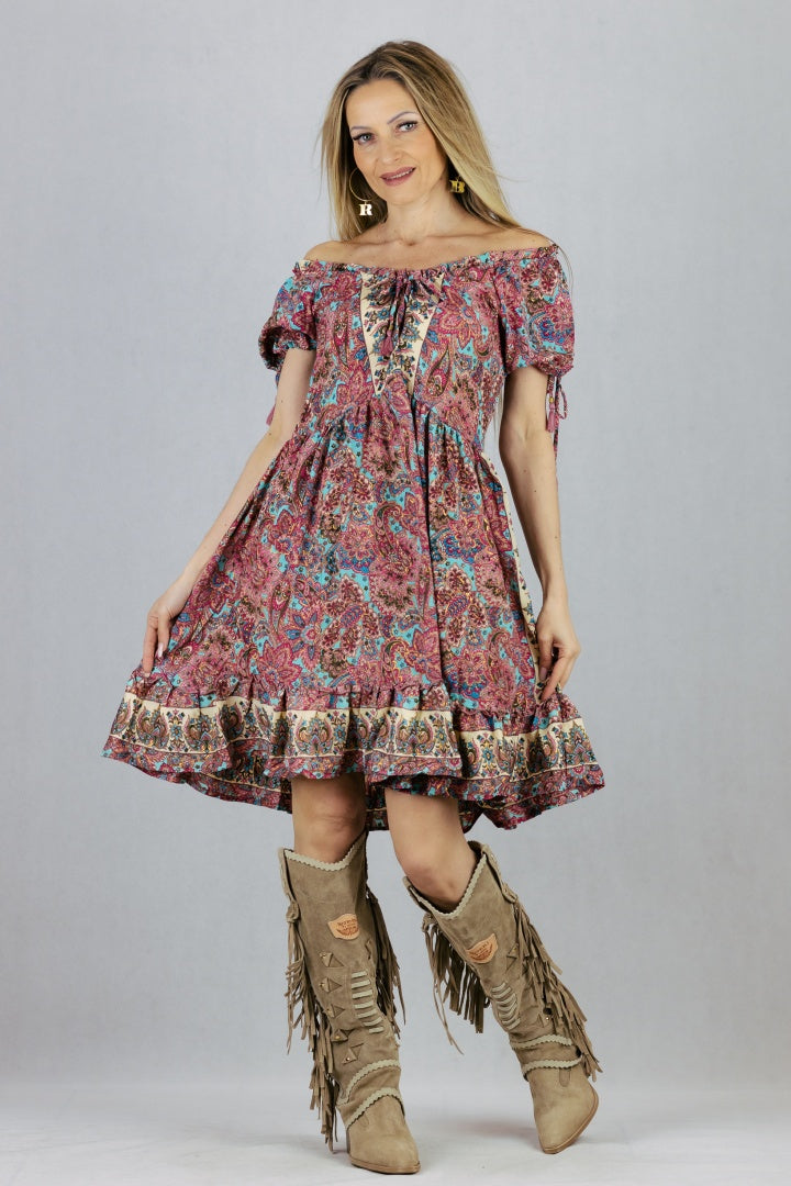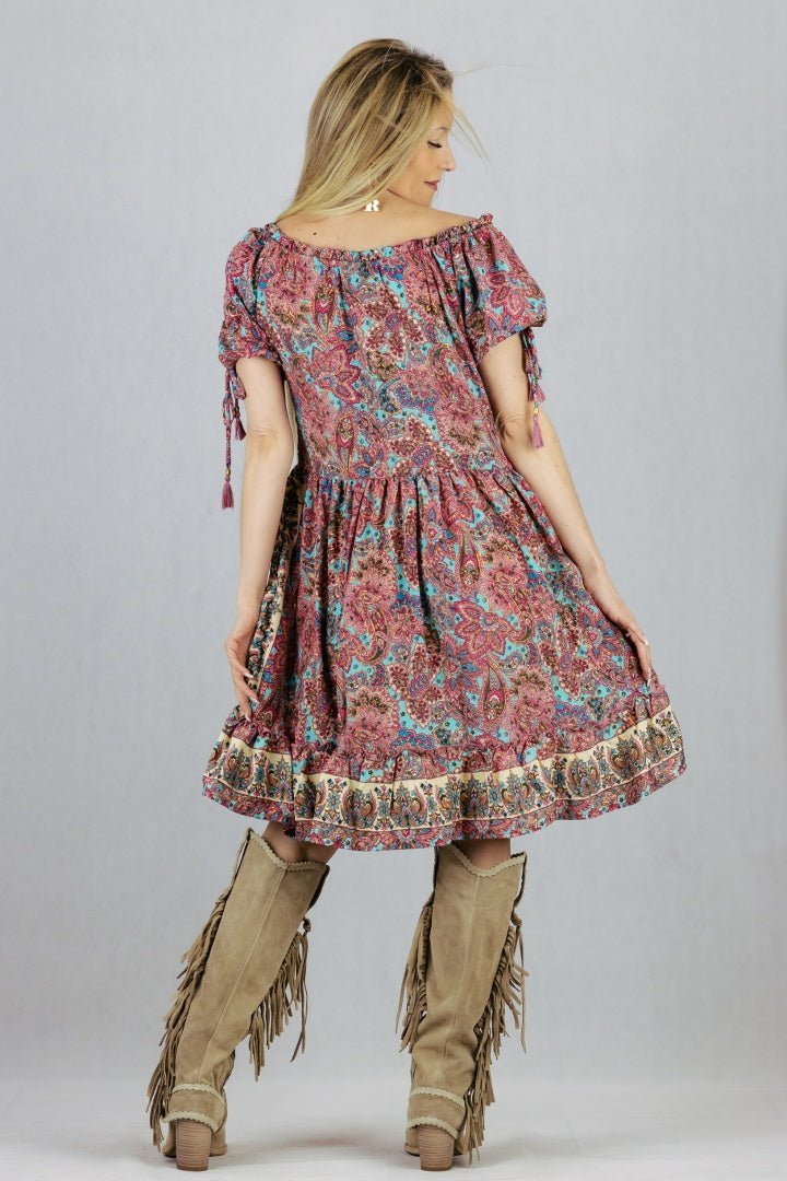 Jedwabna sukienka z krótkim wiązanym rękawem.