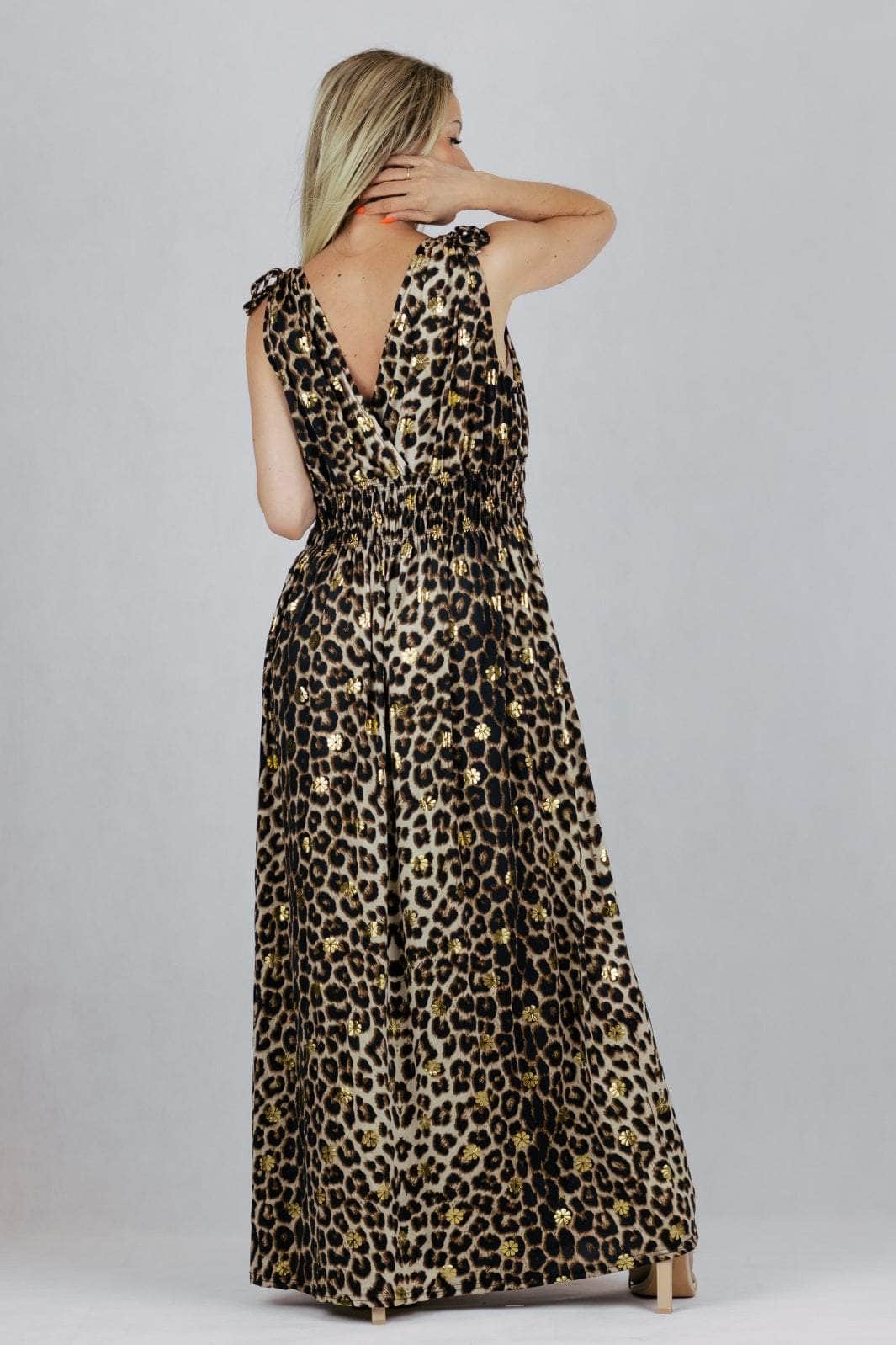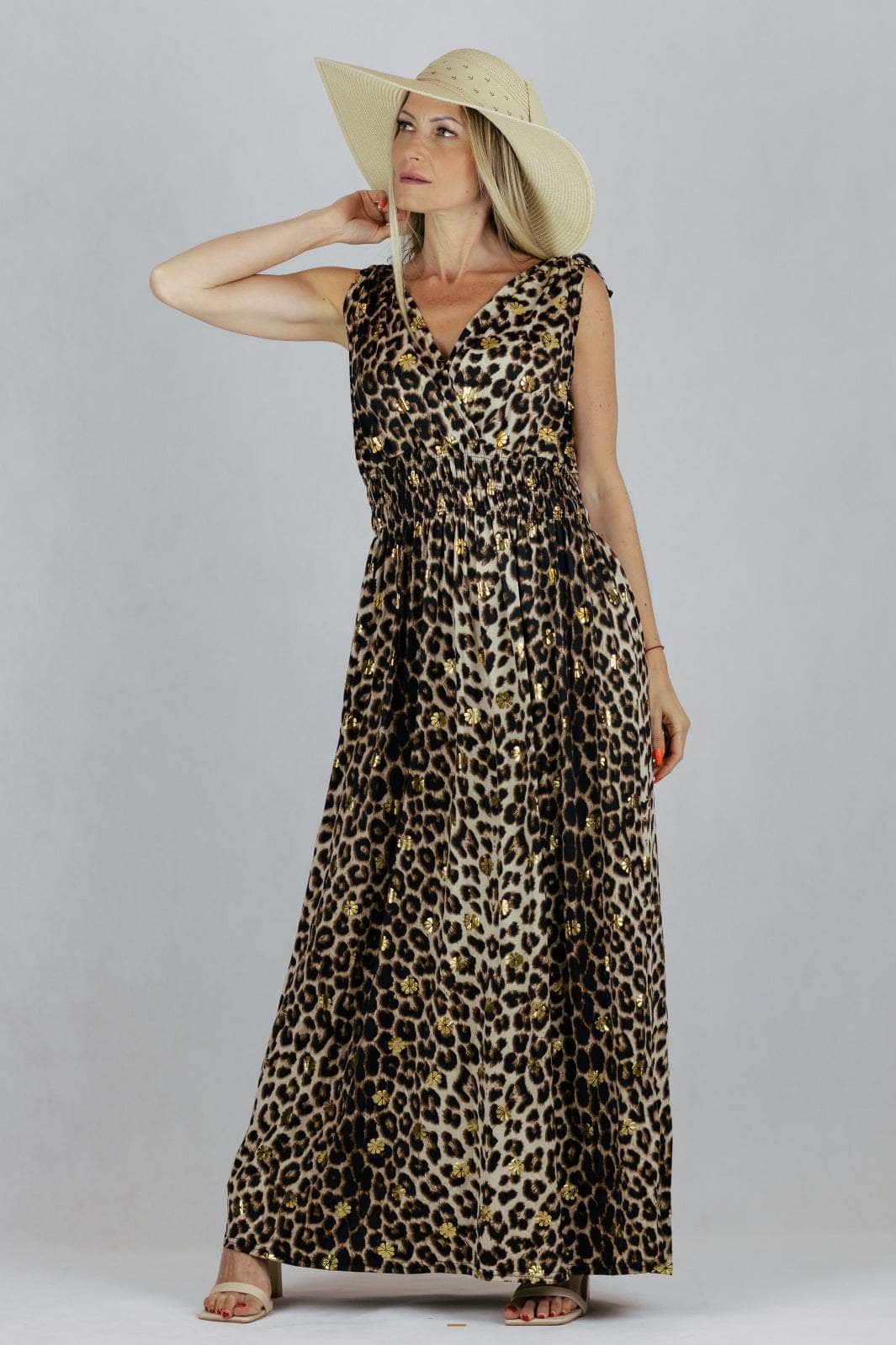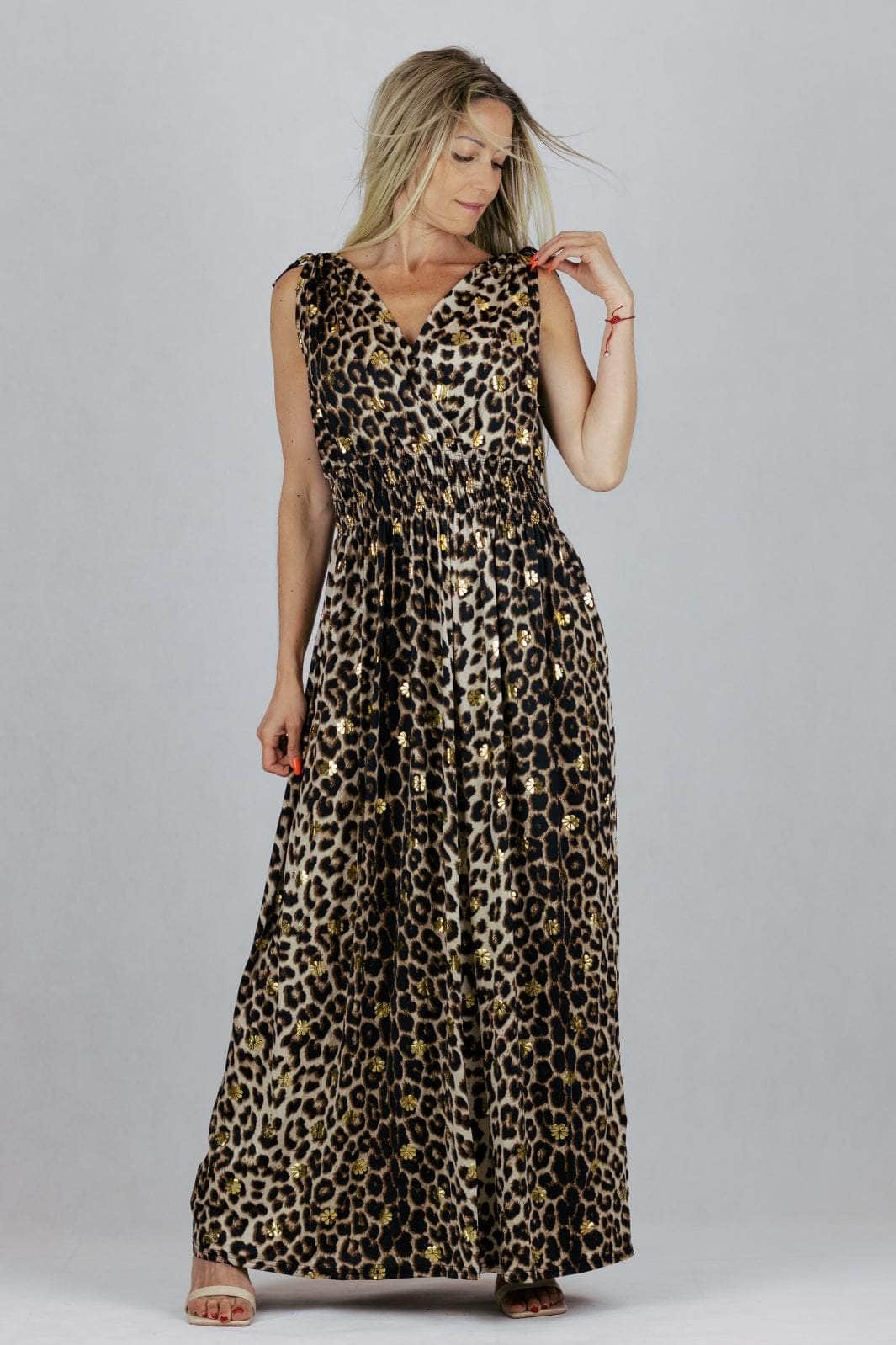 Letnia sukienka z regulacją szerokości ramion, zdobiona drobnymi złotymi kwiatkami.