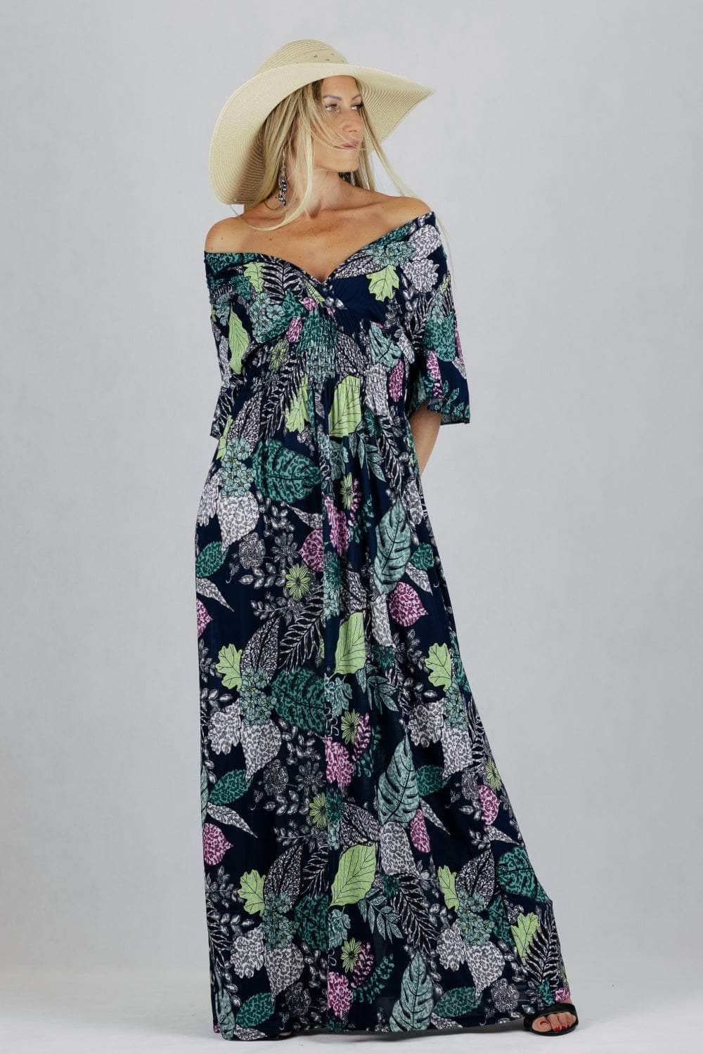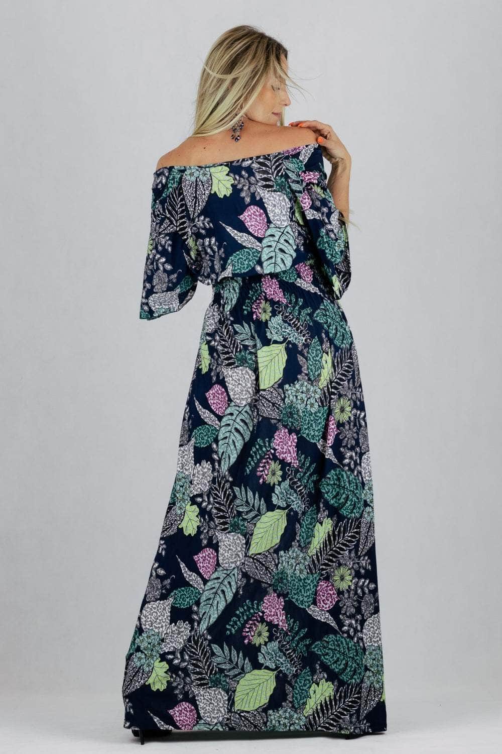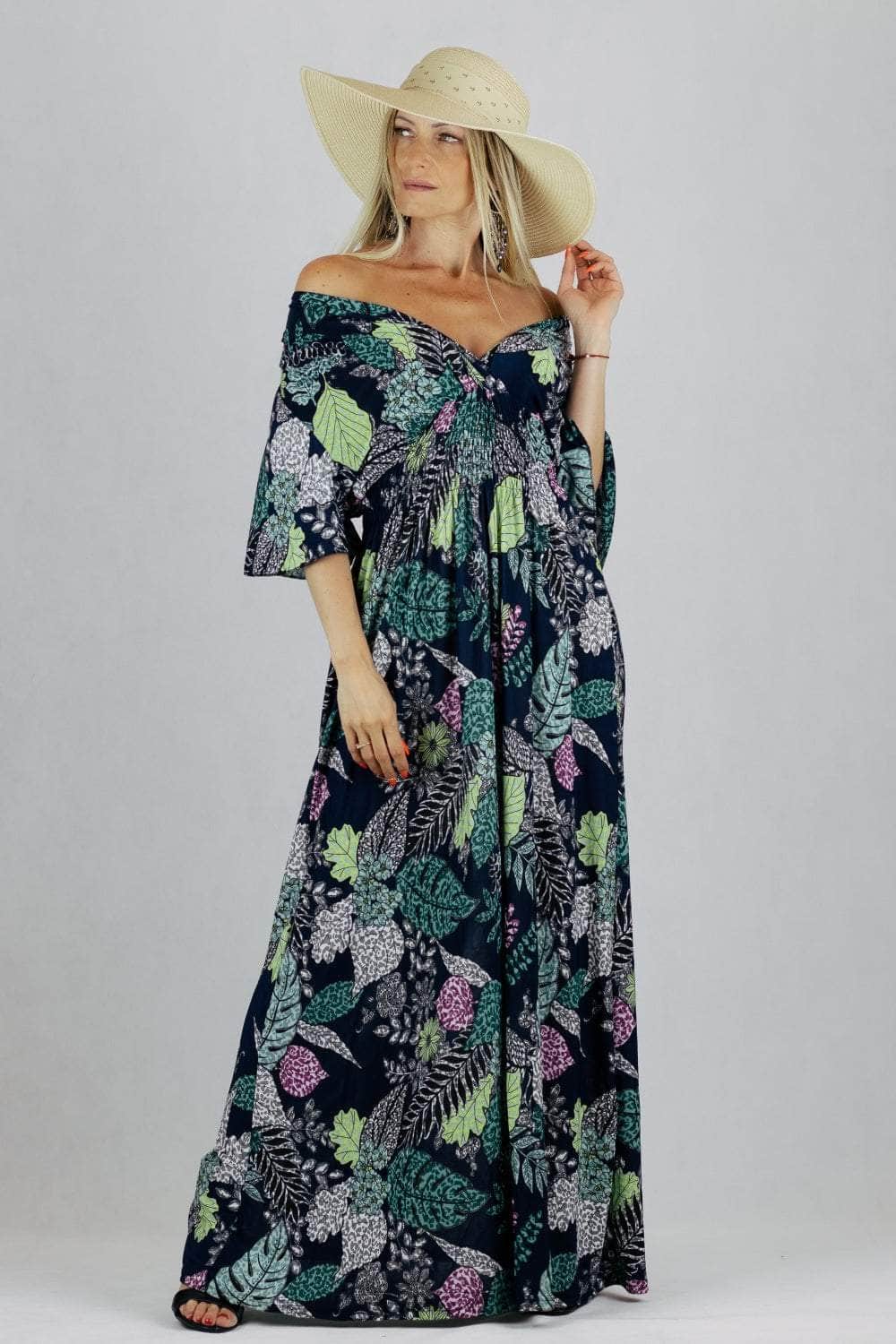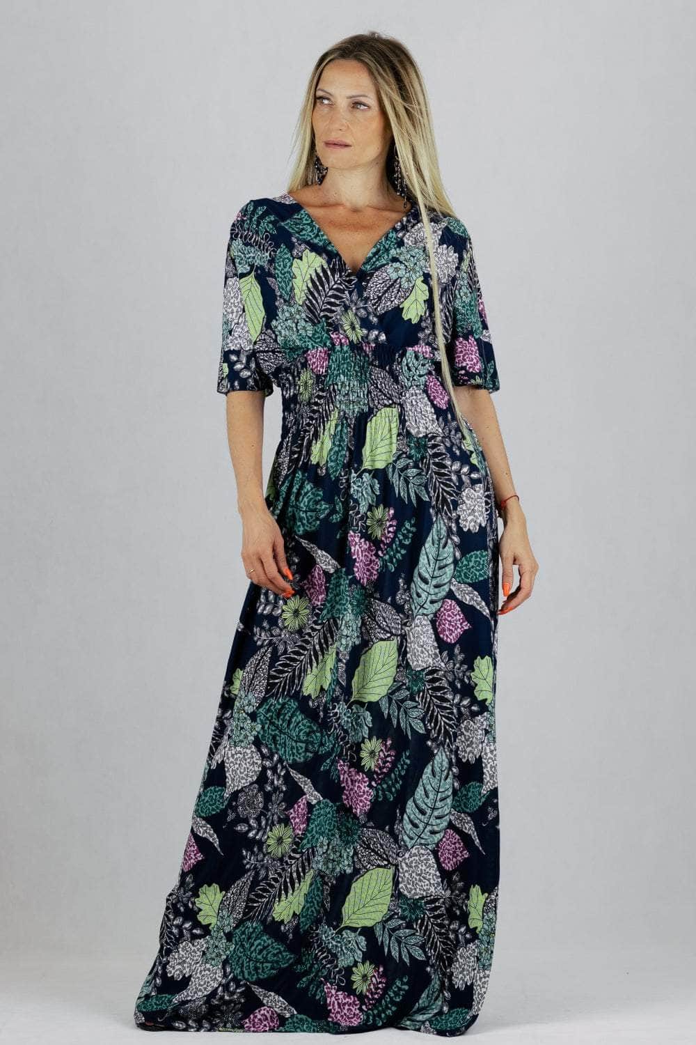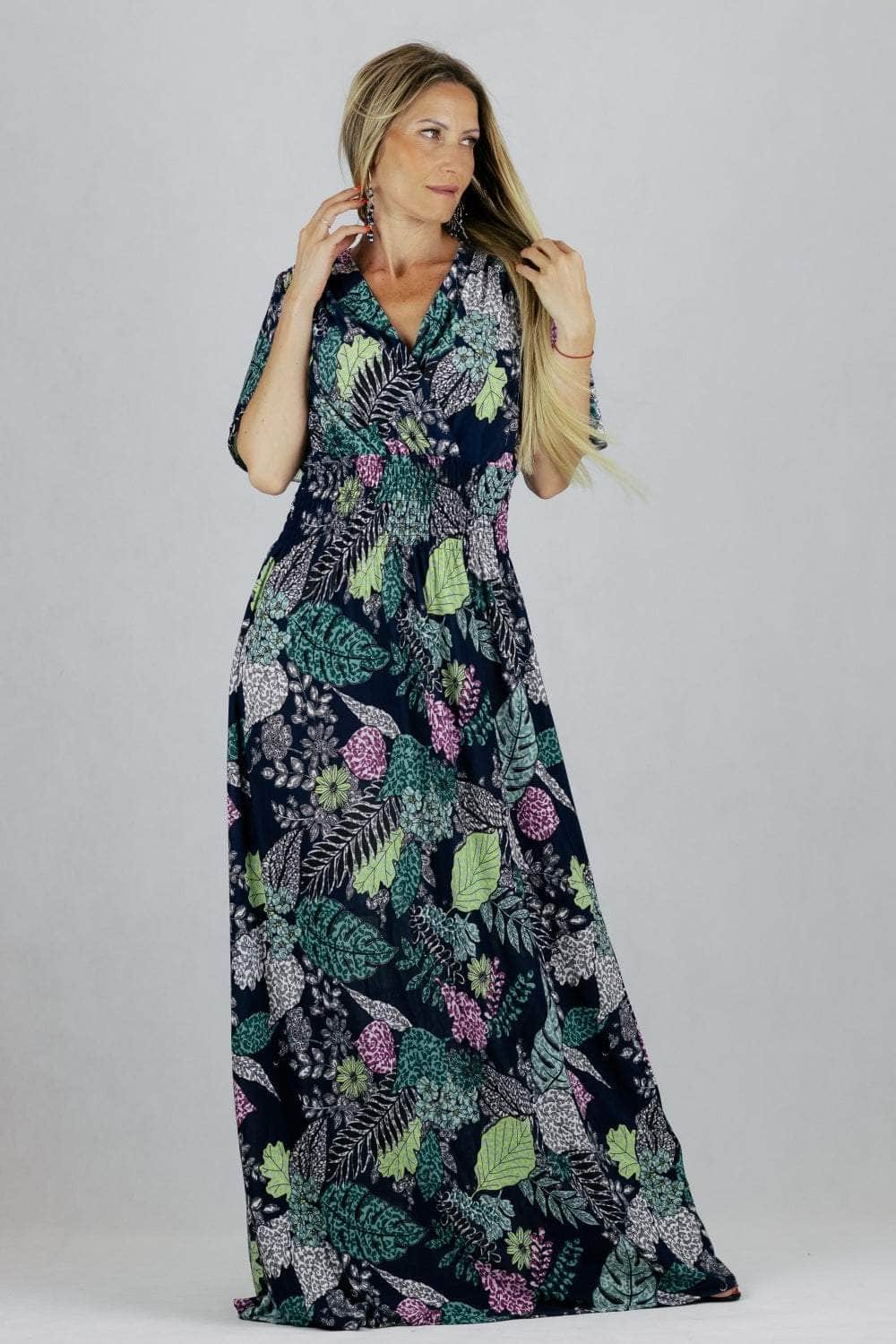 Sukienka maxi z krótkim rękawem i kopertowym dekoltem.