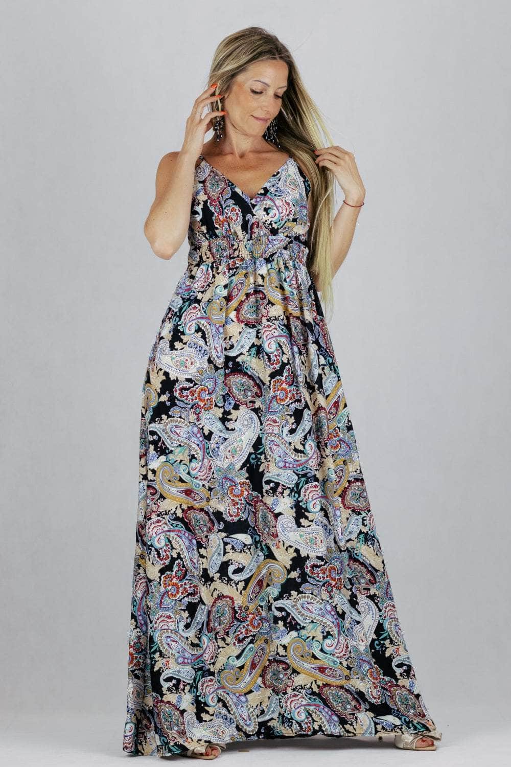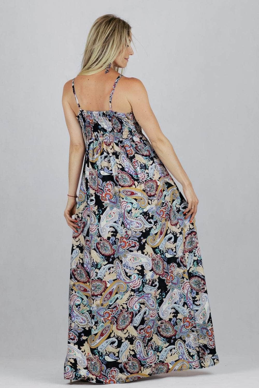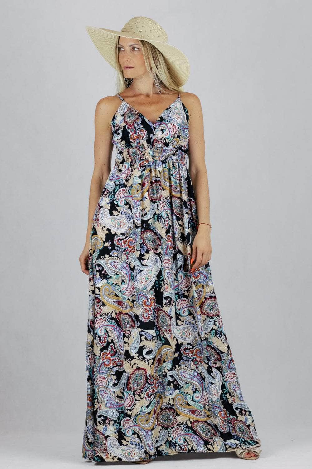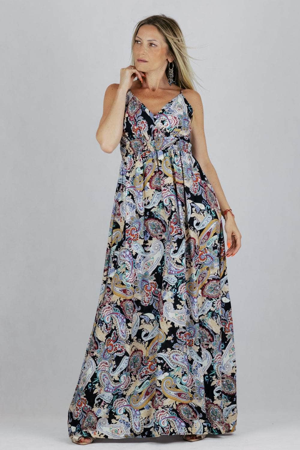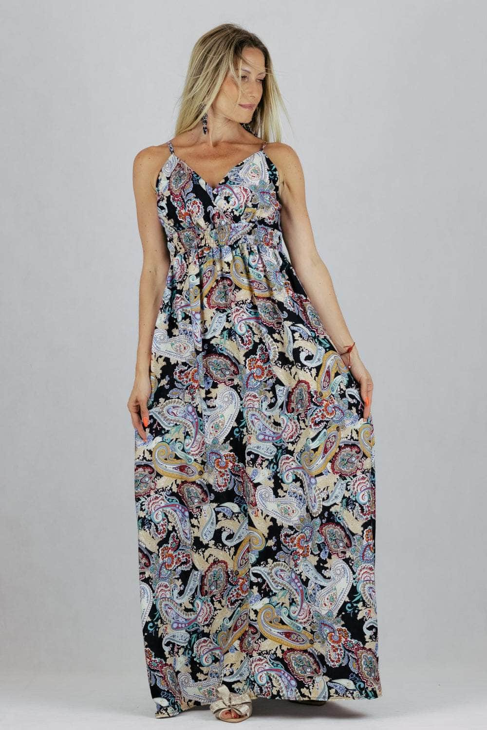 Sukienka maxi we wzory Miss Sara Fashion z regulowanymi ramiączkami. Uszyta z wiskozy.