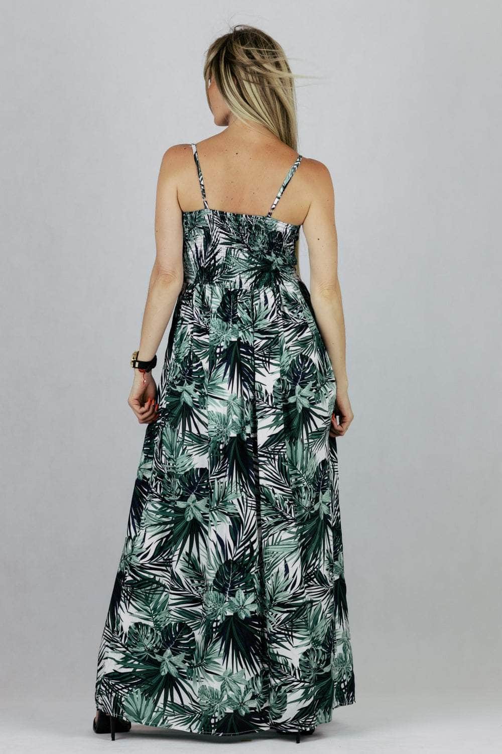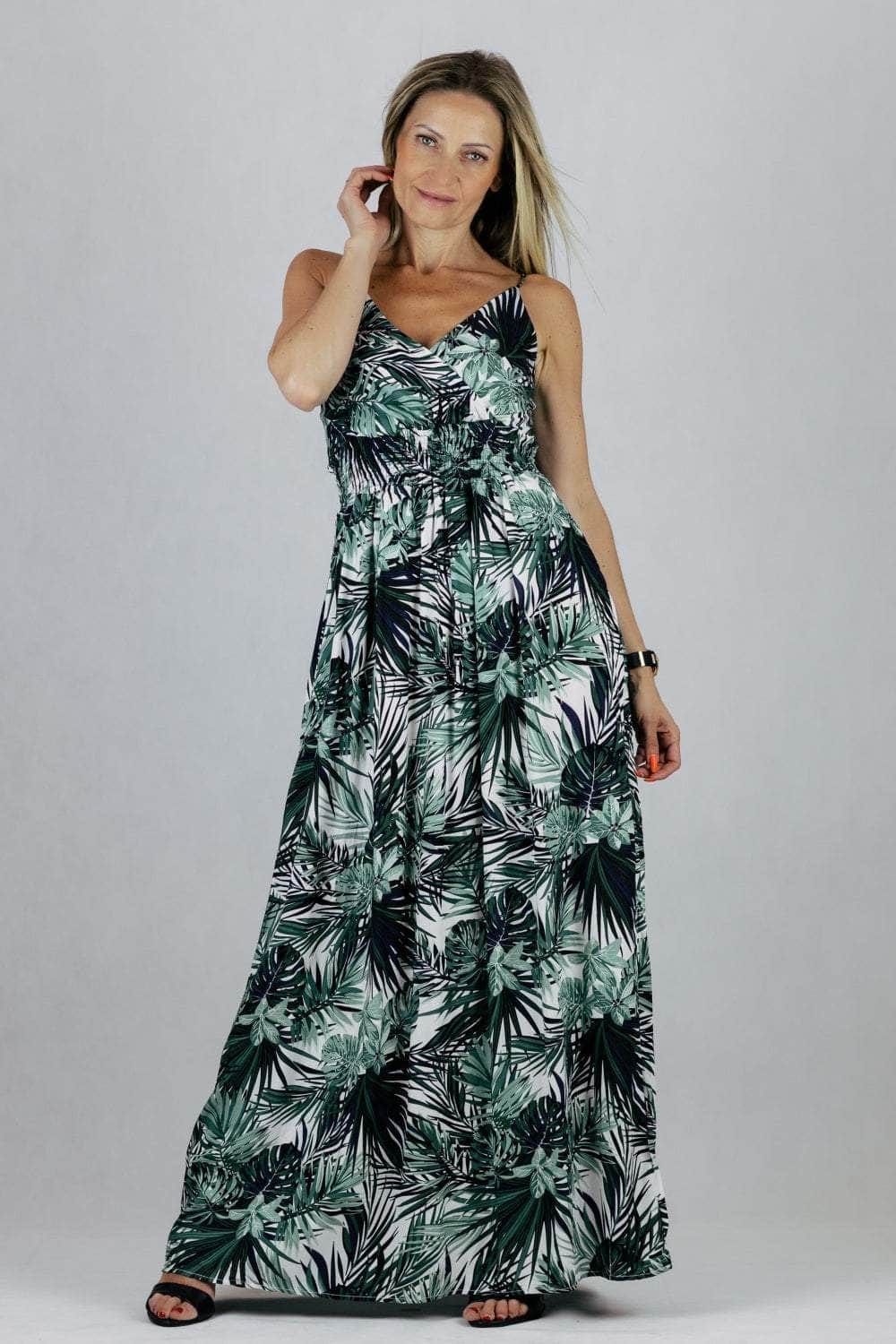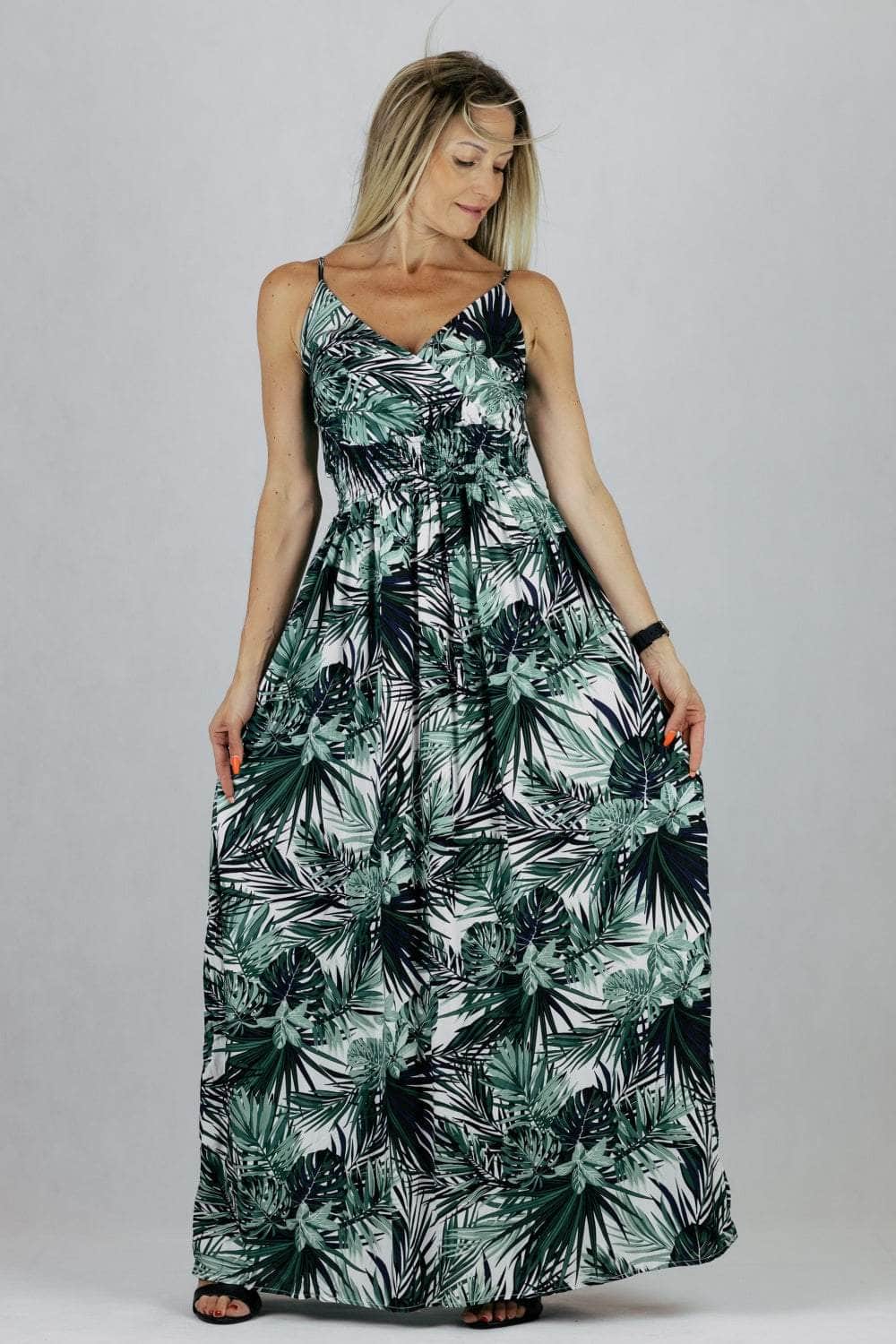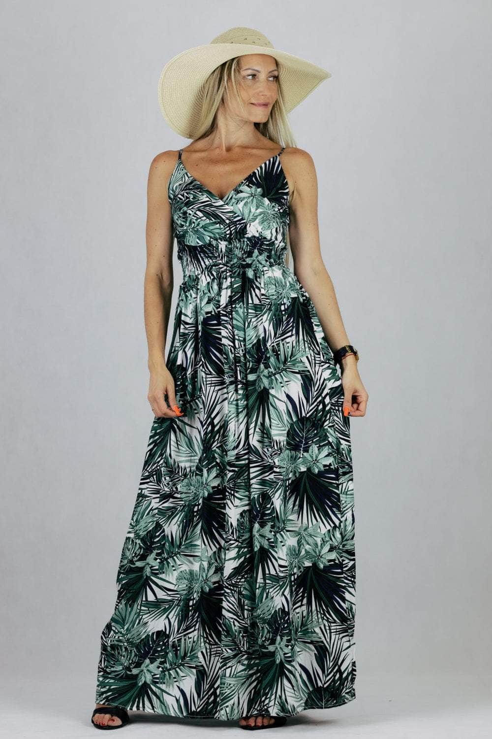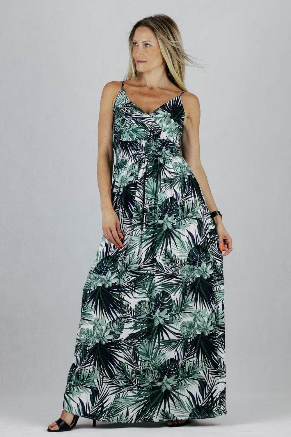 Sukienka maxi Miss Sara Fashion w tropikalnym princie z kopertowym dekoltem. Uszyta z wiskozy.