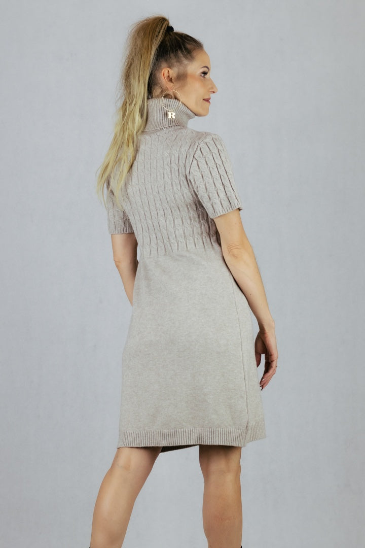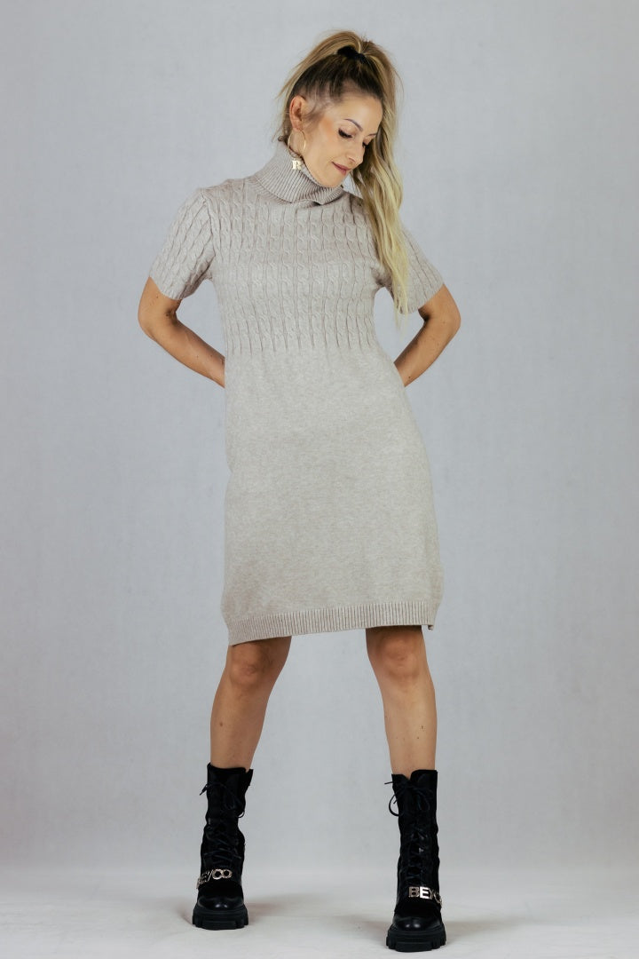 Sweterkowa sukienka z golfem i krótkim rękawem.