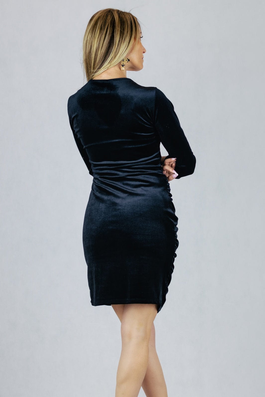 Sukienka z kopertowym dekoltem, uszyta z błyszczącego weluru.