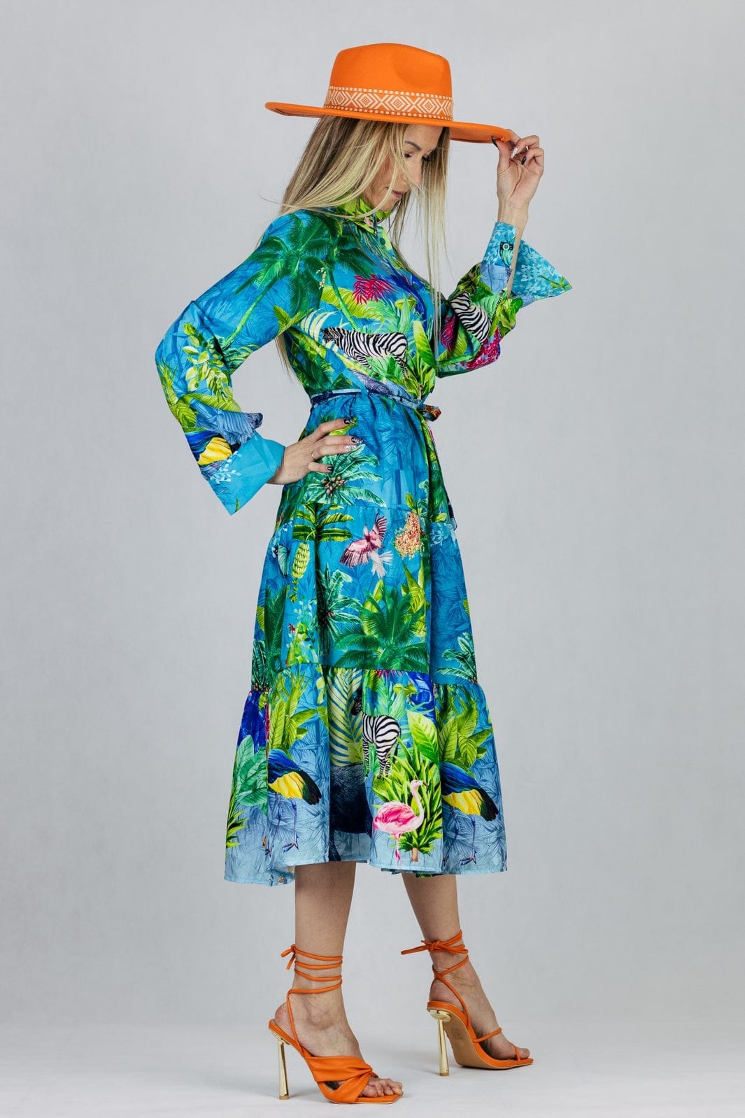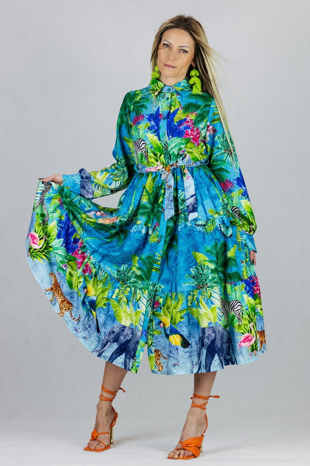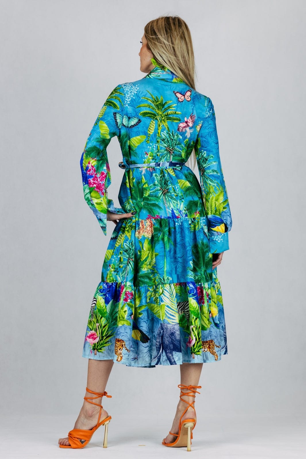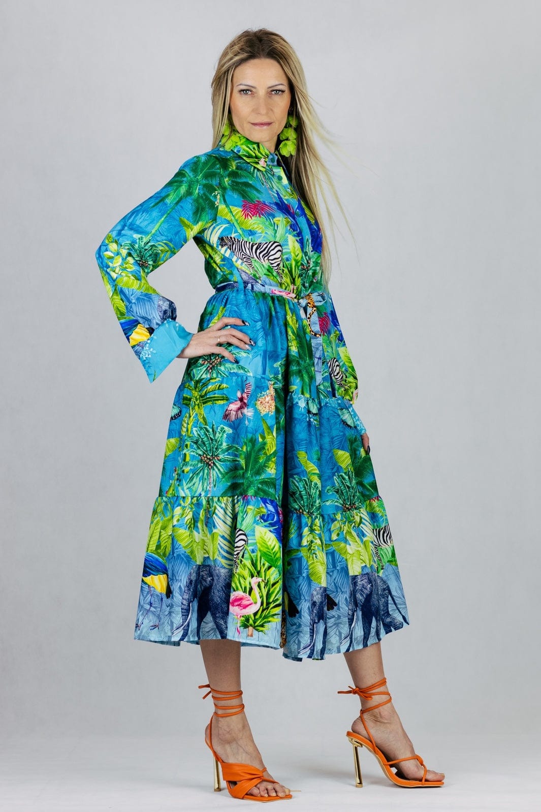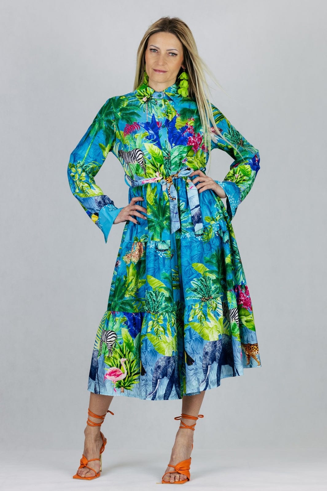 Sukienka z kołnierzykiem z długim rękawem w tropikalnym princie, zapinana na guziki, z materiałowym paskiem w zestawie.