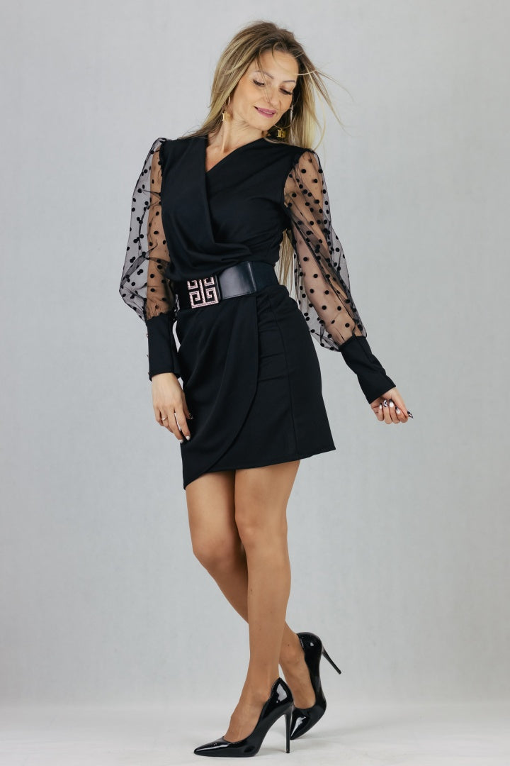 Elegancka sukienka z kopertowym dekoltem i ozdobnymi marszczeniami.