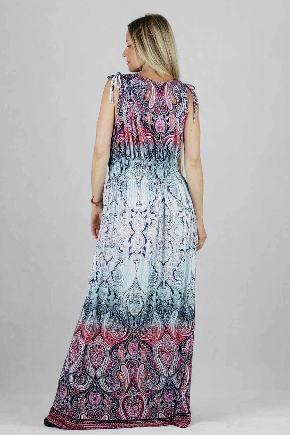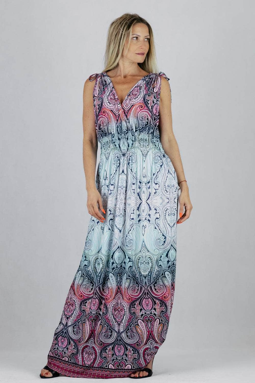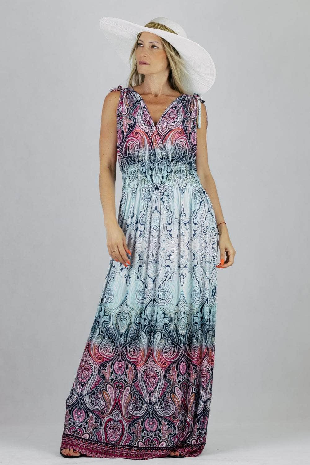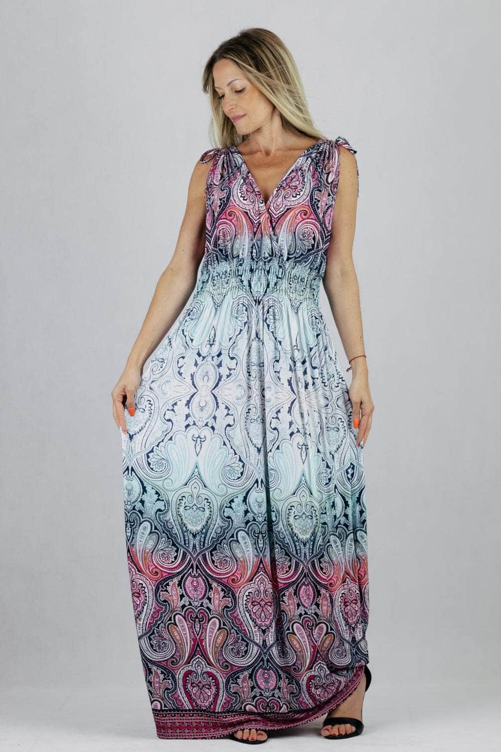 Sukienka maxi we wzory z regulacją szerokości ramion.